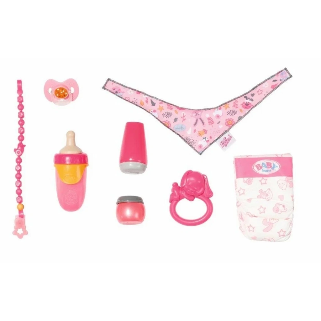 Baby Born bebeğini rahatlatmak için sihirli bir emzik ve önlüğü de set içerisinde bulunuyor. Son olarak bebeği eğlendirmek için bir çıngırak da sete dahildir.