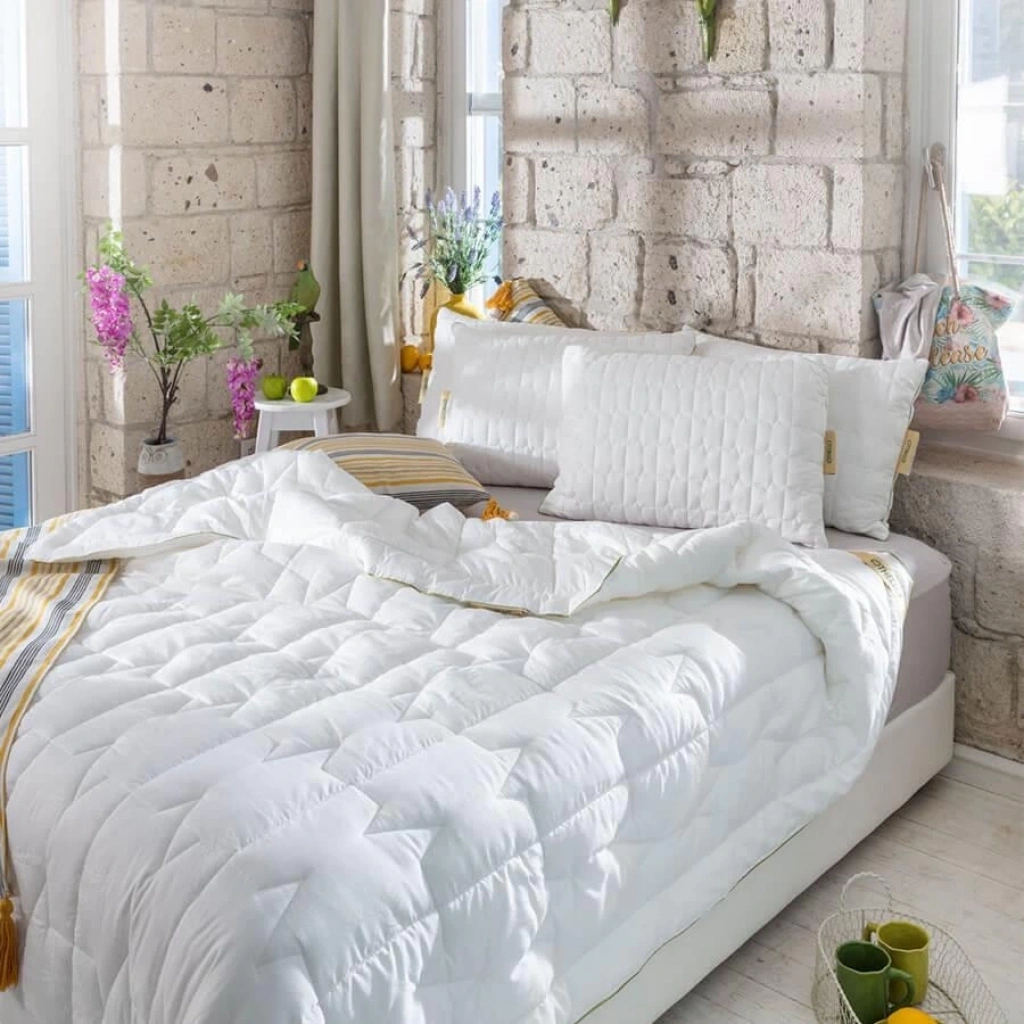 Dış kumaş ı%100 Pamuk düz dokuma özel matwise bambu desen baskılı kumaştır. Doğal bambu pamuk karışımlı kumaşı, ipek gibi yumuşak ve parlaktır. Çok hafiftir, kaşmir ve ipek tuşesine en yakın kumaştır. Kumaşındaki bambu deseni baskısı ile çok şık ve albenilidir. Bambu, pamuktan 3 kat fazla su emer ve 4 kat hızlı kurur. 30˚C’de yıkanabilir, koku yapmaz ve vücudun nefes almasını sağlar. Bambu bitkisinin hamurlaştırılıp eğrilmesinden elde edilen bambu ipliği pamuk gibi diğer iplikler ile dokunarak elde edilir. İçerisinde bulunan Bambu-Kun maddesi bakteri gelişimini engeller, doğal anti-bakteriyal özelliğine sahiptir. İç dolgusu doğal bambu ve elyaf içerir. % 70 1. sınıf HCS (Hollow Conjugated Siliconized) vir gin elyaf dolgu, % 30 bambu dolgudur. Vücutta oluşan teri anında hapseder. Doğal bir dolgu maddesidir. 30 C'de makinada yıkanabilir.Ürün görselinde birden fazla renk ve çeşit olduğunda stokta bulunan ve gönderilecek olan ürün için soru sor kısmından bizimle iletişime geçebilirsiniz