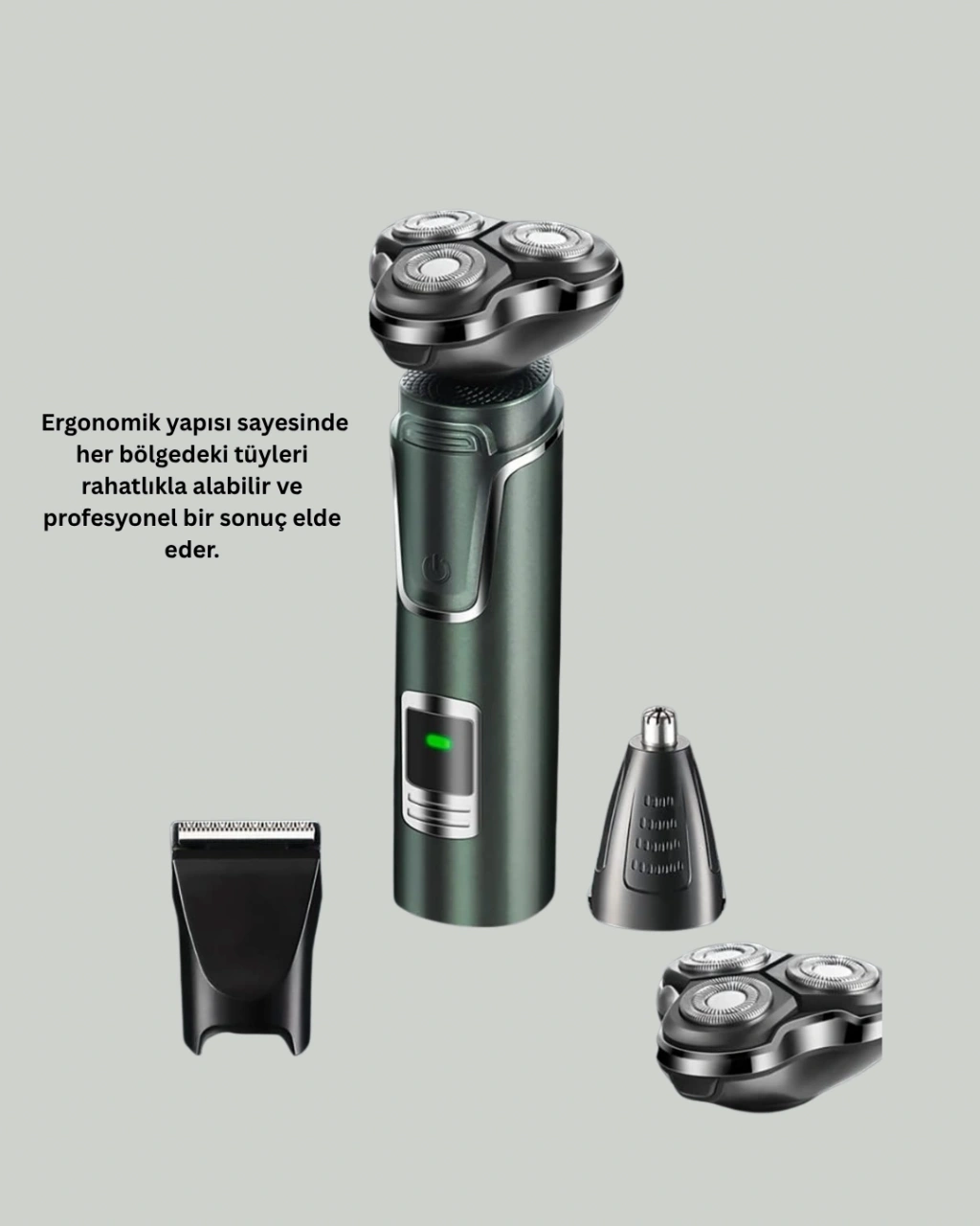 Şık, ergonomik ve fonksiyonel tasarımı ile öne çıkan bu çok yönlü tıraş makinesi; saç, sakal ve burun tüyü temizliğini tek cihazla mümkün kılar. Farklı başlık seçenekleriyle her bölgeye özel bakım sunan cihaz, özellikle yüz bakımını özenle yapan kullanıcılar için tasarlandı.Burun ve kulak temizleme başlığı, hassas bölgelerde güvenli temizlik imkânı sunar. Ucundaki özel kesim bıçağı, tüyleri acıtmadan ve tahriş etmeden alır. Bu özellik, kişisel bakımın en zorlu kısımlarından biri olan burun ve kulak bölgelerini kolaylaştırır.Gelişmiş motor teknolojisi sayesinde hızlı ve güçlü tıraş sağlarken, kuru kullanım özelliği ile su veya köpük gibi yardımcı ürünlere ihtiyaç duymadan işlem yapılabilir. Özellikle yoğun tempoda olan kullanıcılar için hızlı çözüm sunar.USB üzerinden şarj edilebilen cihaz, birkaç saatlik şarjla uzun süreli kablosuz kullanım sunar. Bu özellik seyahat eden, dışarıda zaman geçiren kullanıcılar için ekstra konfor sağlar. İhtiyacınız olan her yerde kişisel bakım rutininizi aksatmadan sürdürebilirsiniz.Kompakt tasarımı ve hafif yapısıyla taşınabilirliği kolaydır. Çantanıza atabilir, iş yerinde ya da seyahatte bile rahatça kullanabilirsiniz. Tüm başlıklar yıkanabilir yapıdadır ve cihazın hijyenik kalmasını sağlar.Estetik, fonksiyonellik ve pratikliği bir araya getiren bu tıraş makinesi, bakımına önem veren erkeklerin en iyi yardımcısı olacak.