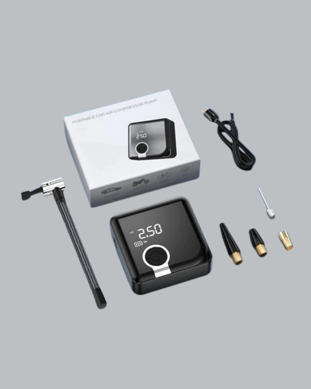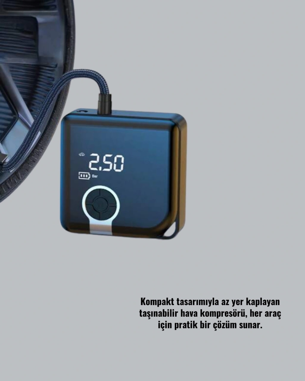 Kompakt ve taşınabilir tasarımıyla öne çıkan bu hava kompresörü, güçlü motoru sayesinde lastiklerinizi kısa sürede şişirir. 150 PSI’a kadar basınç kapasitesi ile otomobil, motosiklet, bisiklet lastikleri ve çeşitli şişme ürünlerde kullanılabilir. Hafif ve ergonomik yapısı, her an yanınızda taşımanıza imkan tanır.Dijital ekran göstergesi sayesinde basınç değerlerini net şekilde görebilir, Psi, Bar ve KPA birimlerinde ölçüm yapabilirsiniz. Önceden ayarlanan değere ulaşıldığında otomatik kapanma özelliği sayesinde güvenli bir kullanım sunar.6000 mAh bataryası uzun ömürlü kullanım sağlar. Tek şarjla dört lastiği şişirme kapasitesine sahiptir. Ayrıca Type-C girişli hızlı şarj özelliği sayesinde cihazınızı kısa sürede şarj edebilirsiniz. Üzerinde yer alan LED ışıklar, acil durumlarda veya gece yolculuklarında büyük kolaylık sağlar.Dayanıklı ABS malzemeden üretilen gövdesi uzun ömürlü kullanım için tasarlanmıştır. Şişme yataklardan spor toplarına kadar geniş kullanım alanı sayesinde günlük yaşamda da oldukça pratik bir üründür.