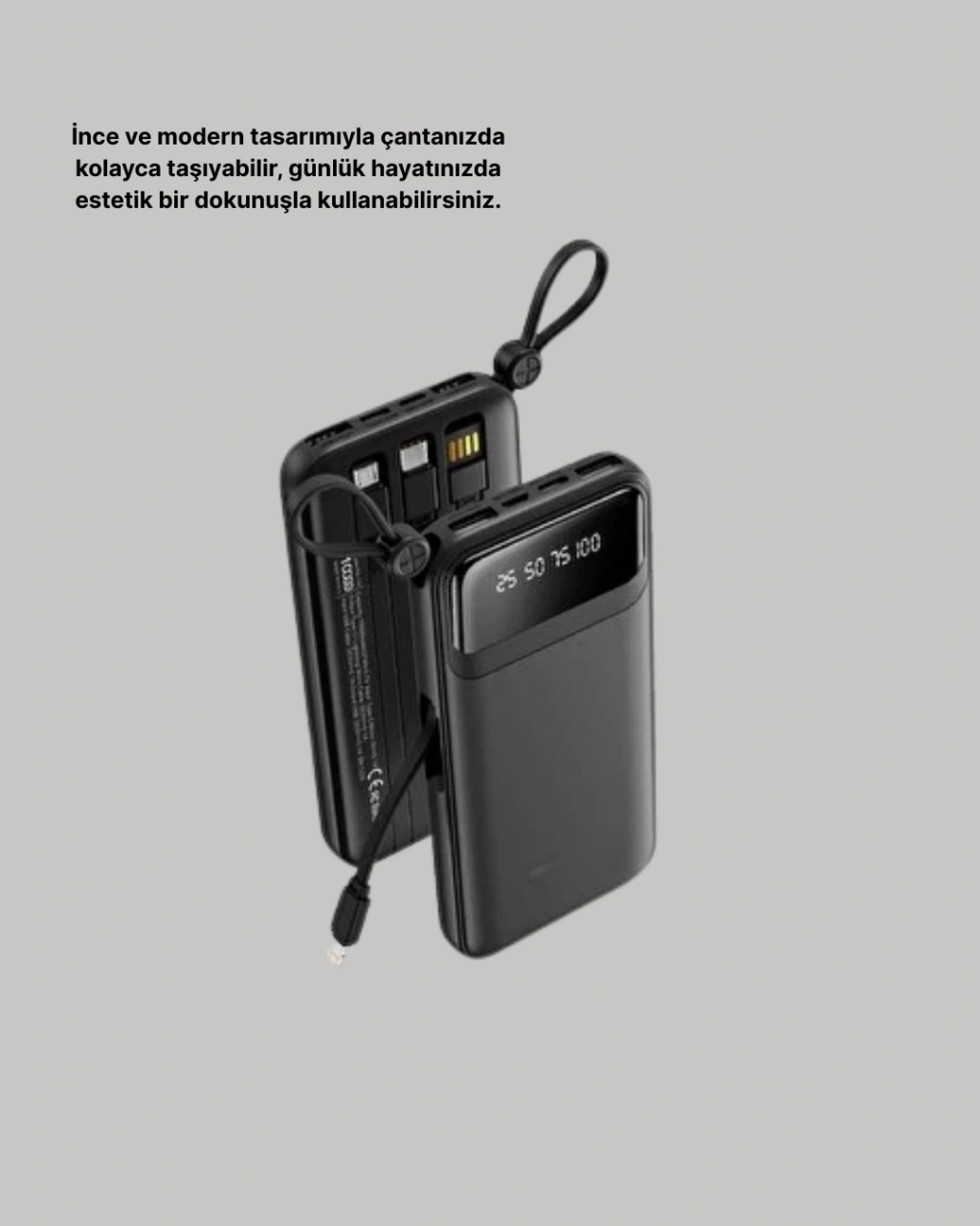 Güçlü 20.000 mAh batarya kapasitesine sahip bu powerbank, yoğun tempoda bile cihazlarınızı her zaman hazır tutar. Hızlı şarj desteği ile telefon ve tabletlerinizi kısa sürede şarj ederek zamandan tasarruf sağlar. 4 çıkışlı yapısı sayesinde aynı anda birden fazla cihazı destekler, özellikle seyahatlerde ve yoğun iş günlerinde hayatı kolaylaştırır.LED ekran göstergesi, şarj durumunu net bir şekilde gösterir. Dahili fener özelliği ile sadece şarj cihazı değil, aynı zamanda pratik bir ışık kaynağıdır. Kompakt boyutları sayesinde çantanıza kolayca sığar ve taşınabilirliğiyle her ortamda kullanım kolaylığı sağlar.Çoklu koruma teknolojisi, aşırı şarj, aşırı akım, voltaj dalgalanmaları ve kısa devrelere karşı güvenli kullanım sunar. Uzun ömürlü ve dayanıklı yapısıyla her an güvenilir enerji kaynağı arayanlar için ideal bir tercihtir.