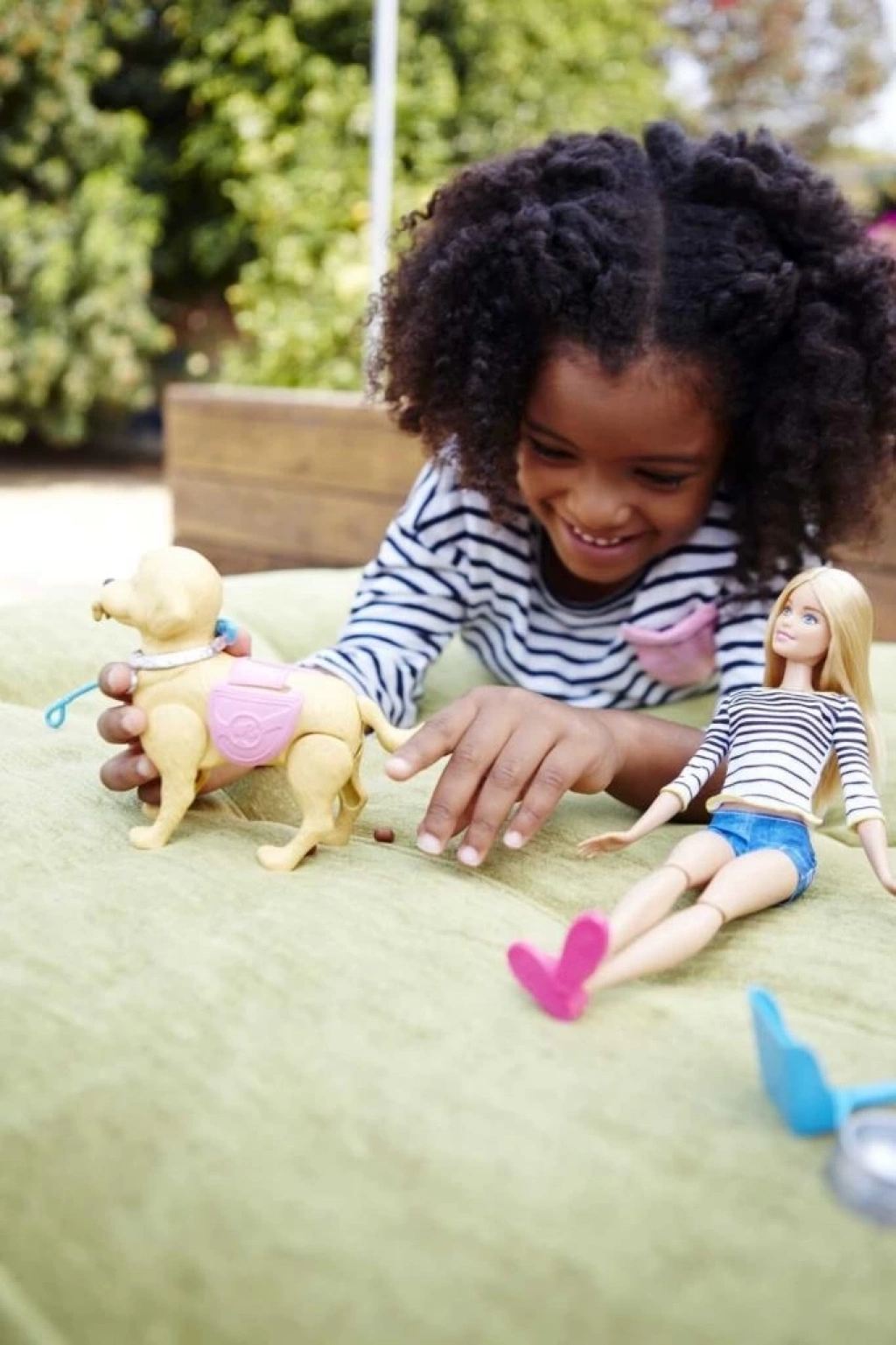 -Bu köpeğin Barbie®'nin kalbinde çok özel bir yeri var. Barbie®'nin köpeğini yürüyüşe çıkarmasına ve ona tuvalet eğitimi vermesine yardım etmek çok eğlenceli. -Tek yapman gereken, kendi başına yürümesi için köpeğin yanındaki kolu kurmak ve tasmasını geriye doğru çekmek. -Barbie®'nin köpeği gezdirmesine yardım et. -Bebeğin eline oturan tasmayla çok daha gerçekçi. -Tuvalet zamanı geldiğinde köpekçiğin kuyruğuna bastır. -Barbie® bebek; fırça ve faraş ile köpekçiğin kakasını temizliyor. -Köpekçiği kabına mama koyarak ve ağzına sığan kemiğiyle besleyerek uslu bir köpek olduğu için ödüllendirebilirsin. -Barbie® bebeğin çizgili bluz, kot şort ve pembe ayakkabılardan oluşan rahat kombini, parkta köpek gezdirmek için mükemmel. Kızlar, bu şirin köpeği yürüyüşe çıkarmaya ve onunla dostluk ve arkadaşlık oyunları oynamaya bayılacak. -Kıyafetli ve aksesuarlı Barbie® bebek ile birlikte (tasmalı) yürüyebilen ve tuvalet yapabilen köpek, fırça, faraş, plastik köpek 'kakaları', besleme kabı ve ödül maması dahildir. -Bebek tek başına ayakta duramaz ve yürüyemez. -Renkler ve süslemeler farklılık gösterebilir. -UYARI: 36 aydan küçük çocuklar için uygun değildir. Küçük Parçalar.Ürün görselinde birden fazla renk ve çeşit olduğunda stokta bulunan ve gönderilecek olan ürün için soru sor kısmından bizimle iletişime geçebilirsiniz