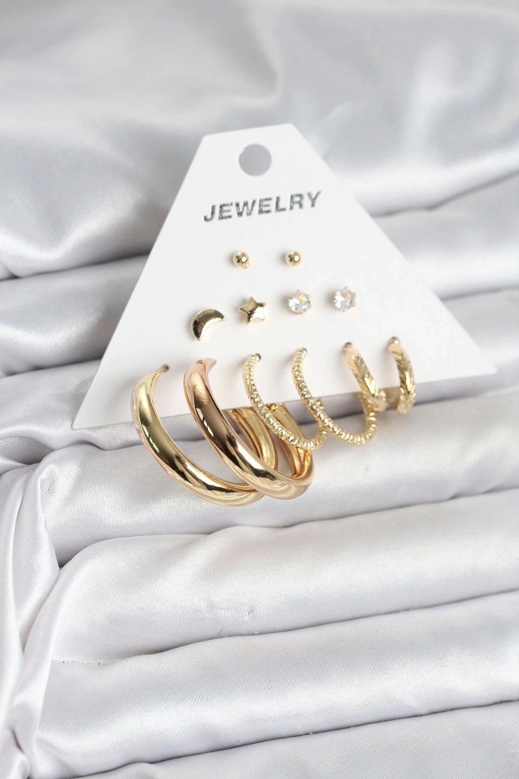 BFS Gold Renk 6 Çiftli Pirinç Kadın Küpe Seti