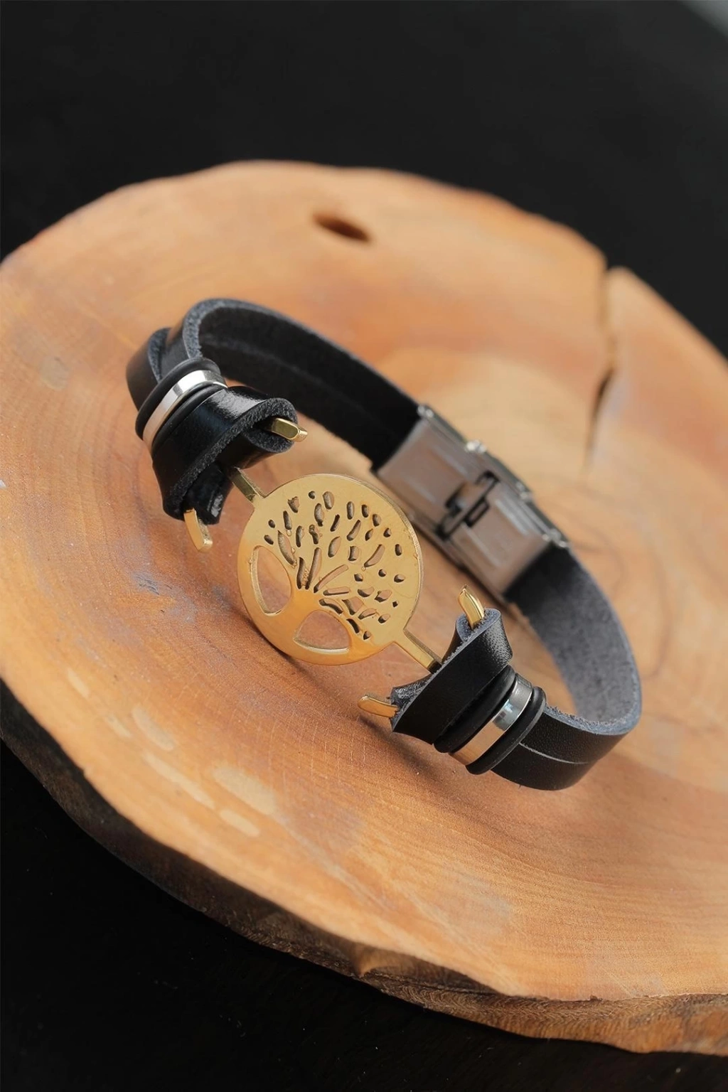 Kendinizi Gold Renk Metal Ağaçlı Tasarım Siyah Renk Deri Erkek Bileklik ile her zaman şık göreceksiniz.