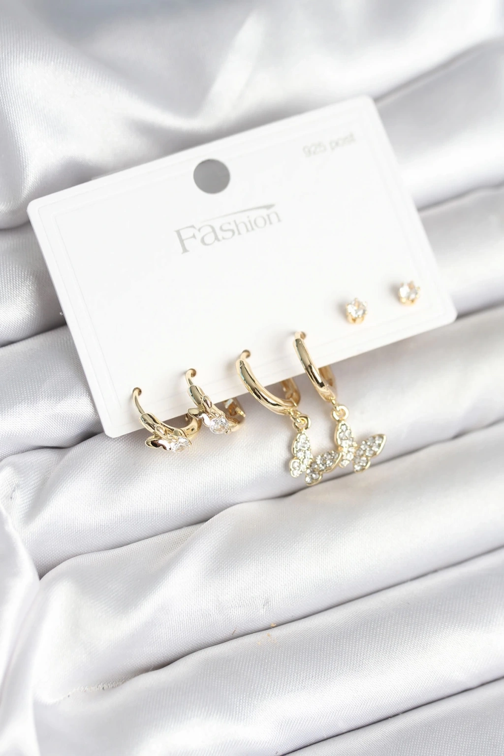 BFS Gold Renk Pirinç Kelebek Model 925 Ayar Gümüş Çivili Kadın Küpe Seti