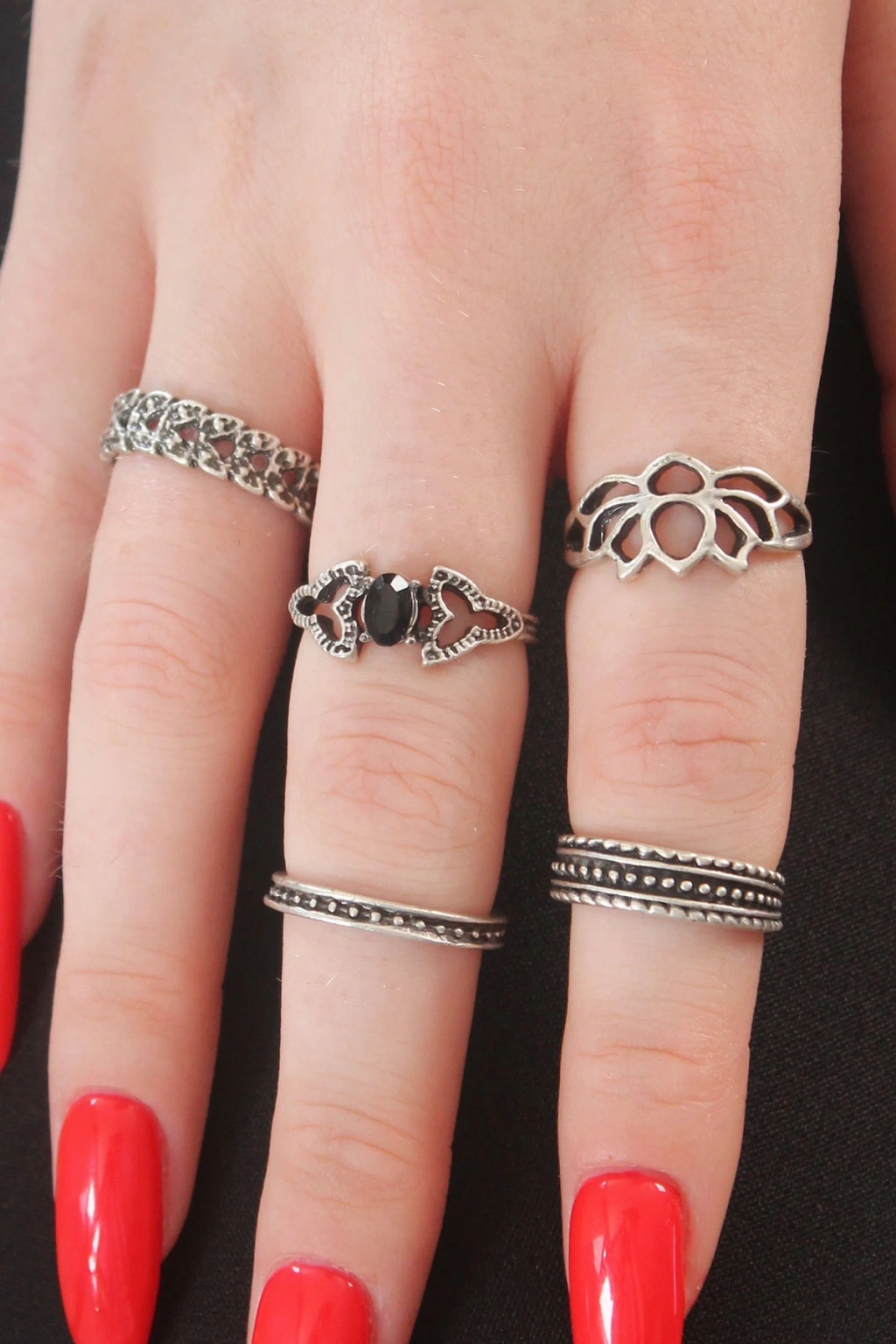 BFS Gümüş Renk Lotus Model Siyah Kristal Taş Detay Bayan Yüzük Kombin