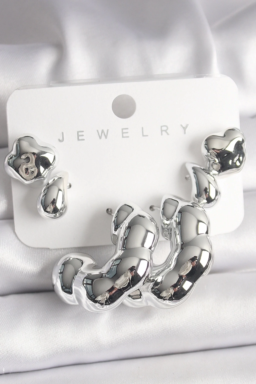 BFS Gümüş Renk Yonca Damla Halka Model CCB Plastik Kadın Küpe Seti