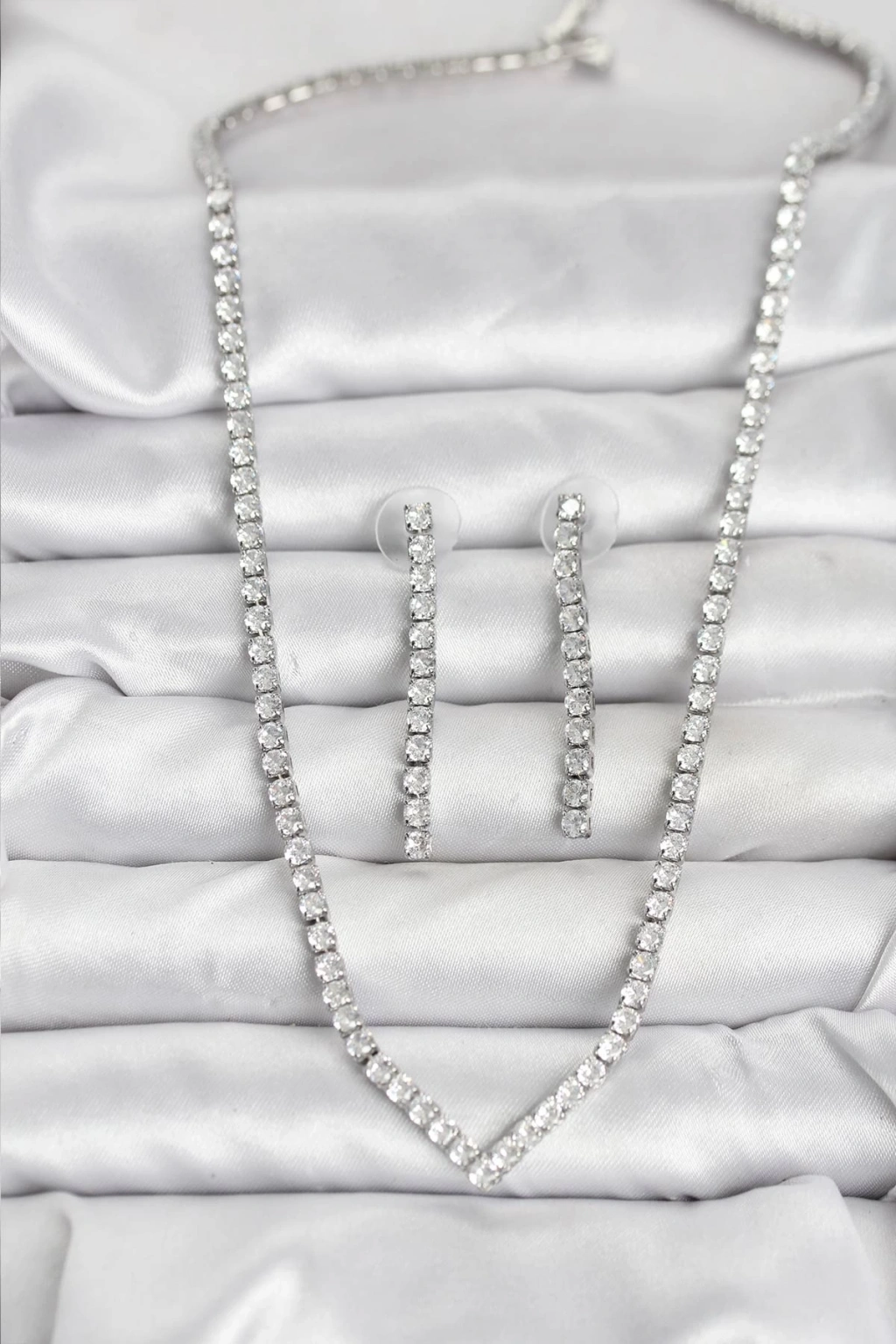 BFS Gümüş Renk Zirkon Taşlı Kadın Kolye Küpe Seti