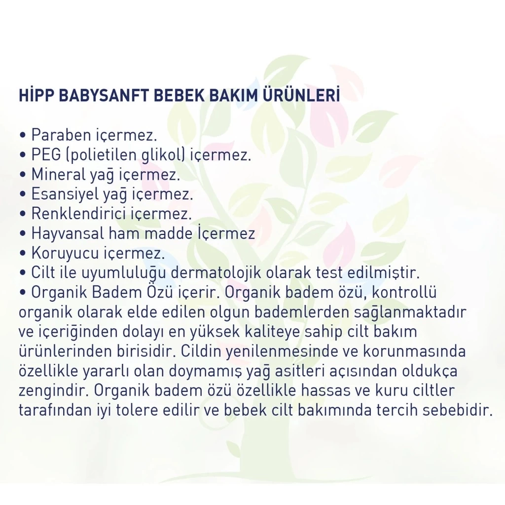 HiPP Babysanft çocuk bakım kremi, küçük çocukların has cildini nemlendirmeye yardımcıdır. Eğlenceli ambalajı sayesinde çocuklara bakım yapma alışkanlığını da kazandırır. Hayvansal ham madde içermez. Paraben içermez. PEG (polietilen glikol) içermez. Renklendirici içermez. Koruyucu içermez. Cilt ile uyumluluğu dermatolojik olarak test edilmiştir. Organik badem yağı, kontrollü organik olarak elde edilen olgun bademlerden sağlanmaktadır ve içeriğinden dolayı en yüksek kaliteye sahip cilt bakım ürünlerinden birisidir. Cildin yenilenmesinde ve korunmasında özellikle yararlı olan doymamış yağ asitleri açısından oldukça zengindir.Ürün görselinde birden fazla renk ve çeşit olduğunda stokta bulunan ve gönderilecek olan ürün için soru sor kısmından bizimle iletişime geçebilirsiniz