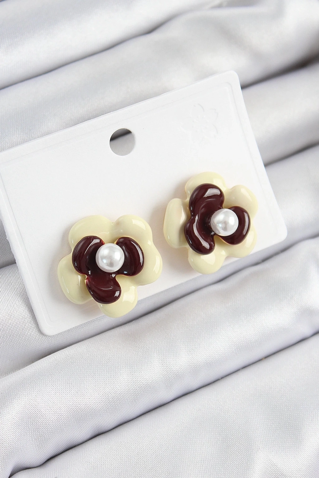 BFS İnci Detaylı Krem Kahverengi Renk Papatya Model Kadın Küpe
