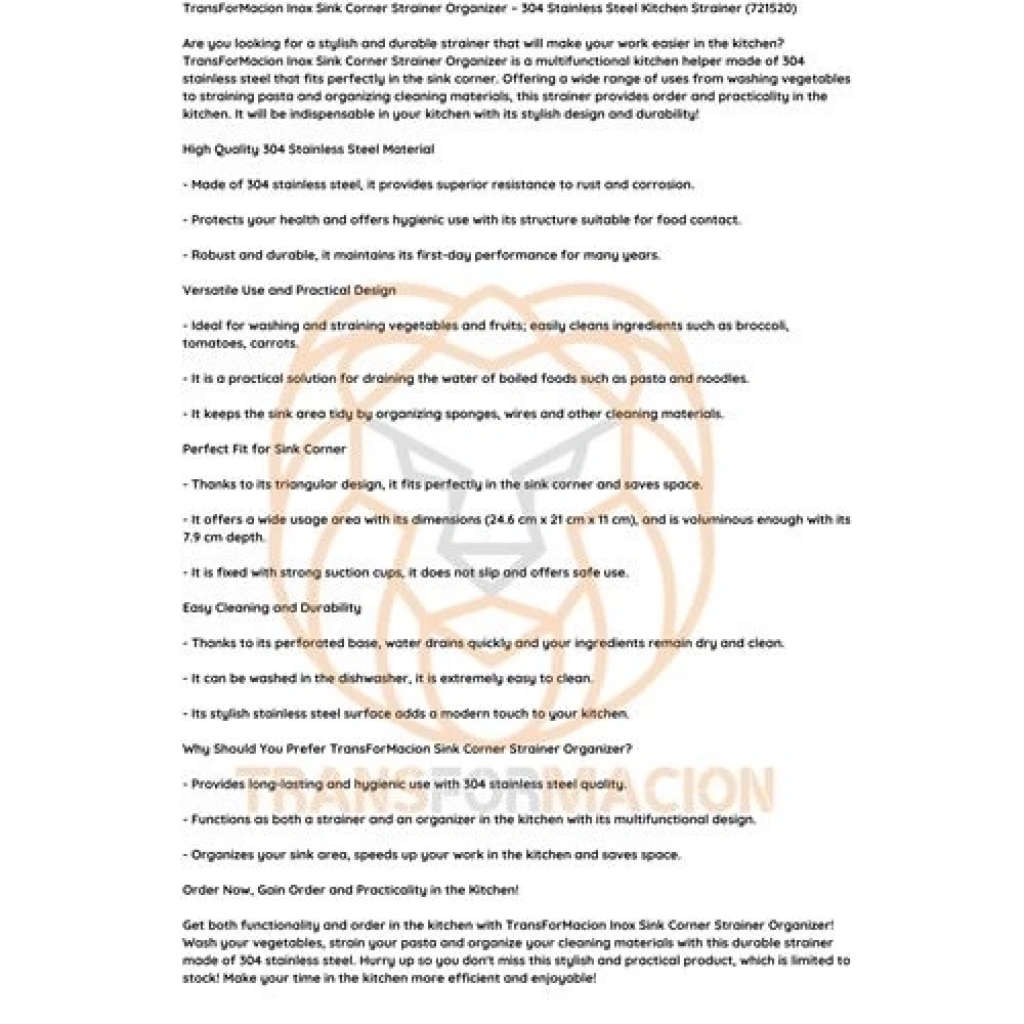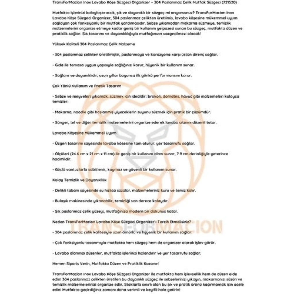 Mutfakta işlerinizi kolaylaştıracak, şık ve dayanıklı bir süzgeç mi arıyorsunuz? Inox Lavabo Köşe Süzgeci Organizer, 304 paslanmaz çelikten üretilmiş, lavabo köşesine mükemmel uyum sağlayan çok fonksiyonlu bir mutfak yardımcısıdır. Sebze yıkamadan makarna süzmeye, temizlik malzemelerini organize etmeye kadar geniş bir kullanım yelpazesi sunan bu süzgeç, mutfakta düzen ve pratiklik sağlar. Şık tasarımı ve dayanıklılığıyla mutfağınızın vazgeçilmezi olacak!