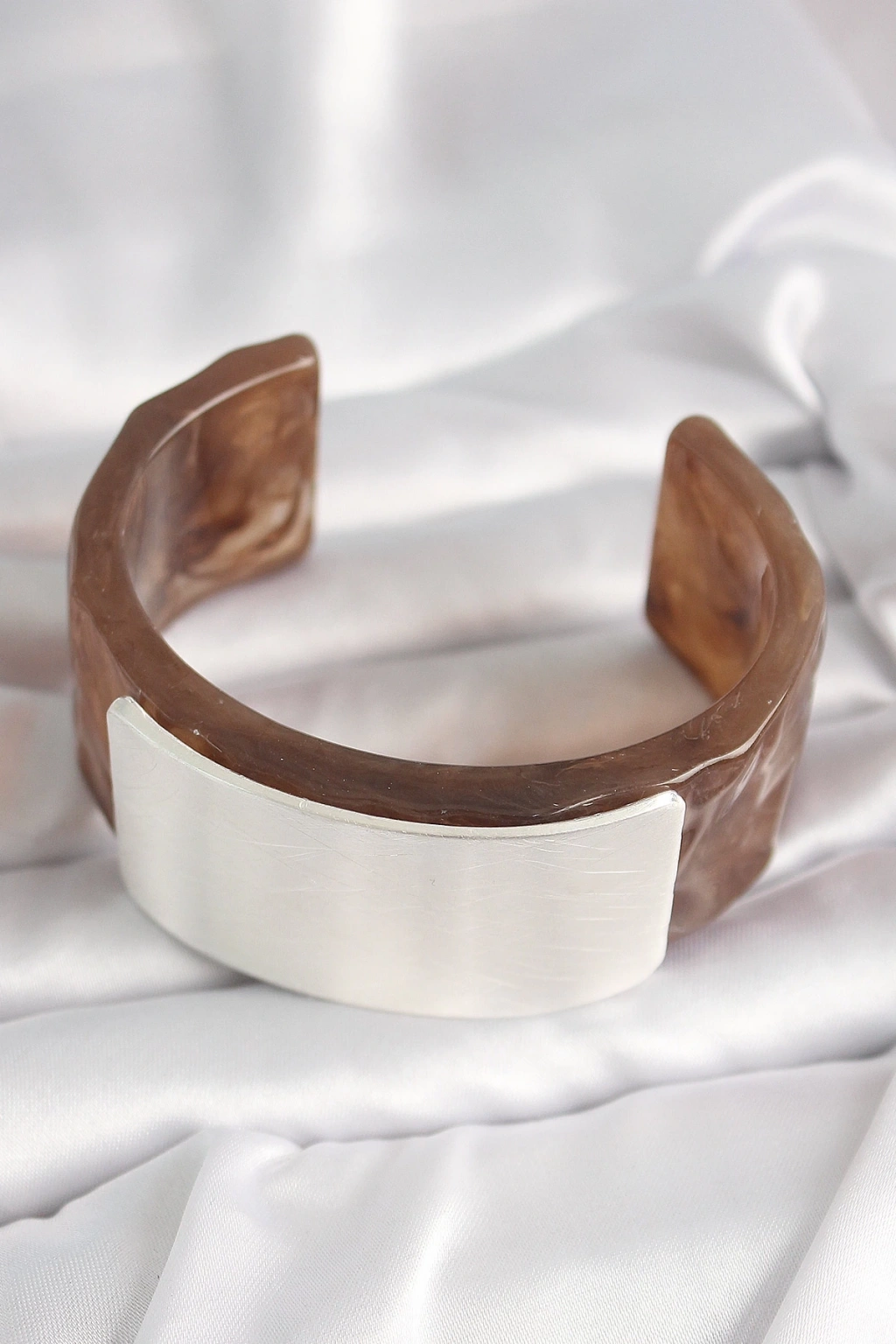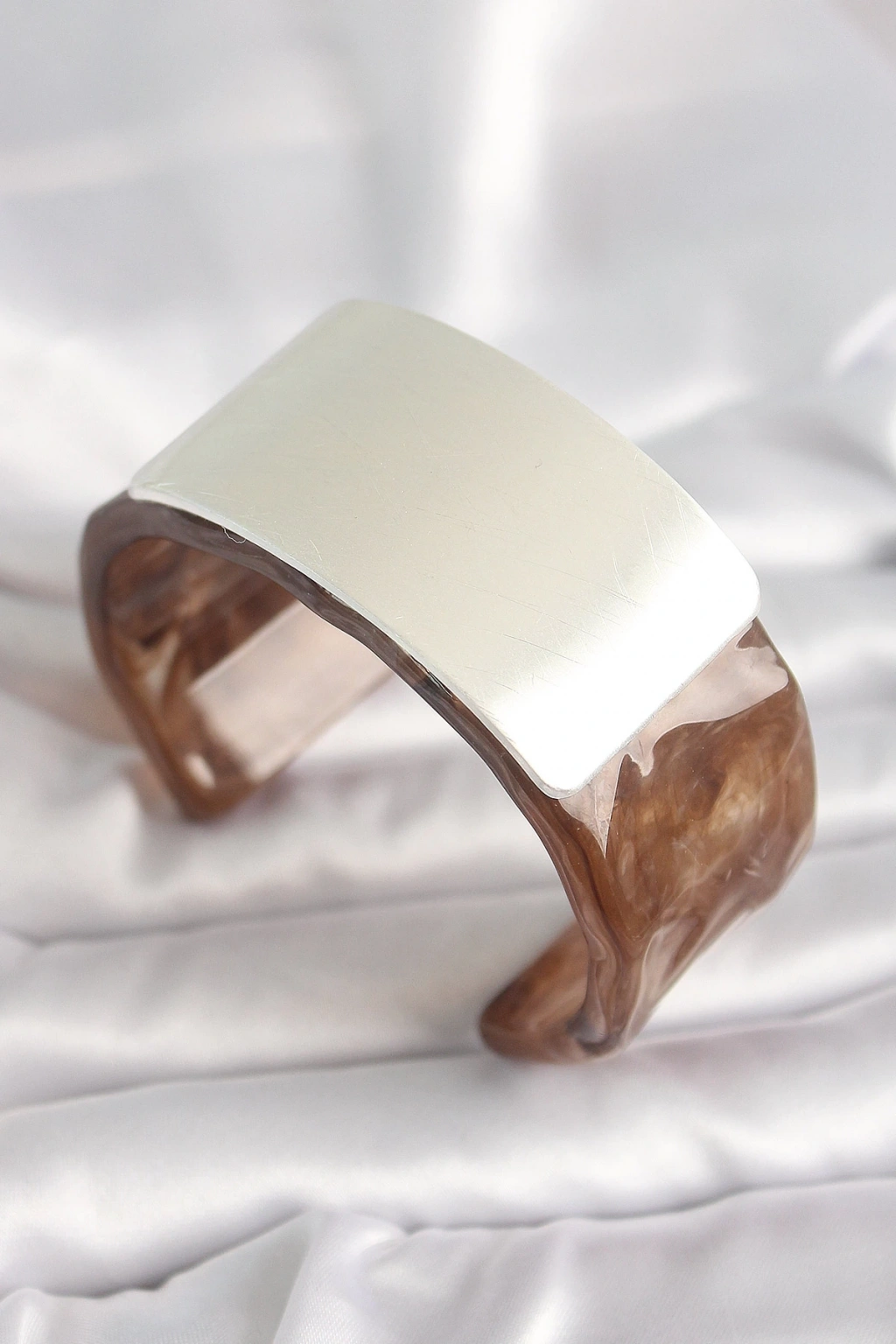 BFS Kahverengi Mermer Desen Akrilik Plastik Gümüş Dikdörtgen Plaka Vintage Kadın Bilezik