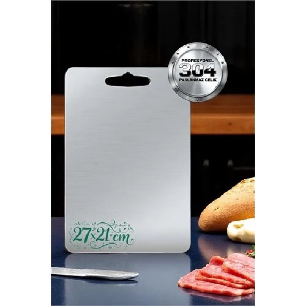 "304 paslanmaz çelik doğrama tahtası, kulplu mutfak kesme tahtası olarak hijyenik ve uzun ömürlü kullanım sunar. Tekli paslanmaz çelik kesme tahtası, 27x21cm ölçüsüyle hem ev hem profesyonel mutfaklar için ideal tercihtir."Tekli paslanmaz çelik kesme tahtası, 27x21cm ölçüsüyle hijyenik ve pratik kullanım sunarken, kulplu mutfak kesme tahtası tasarımı sayesinde taşınabilirlik sağlar; 304 paslanmaz çelik doğrama tahtası, profesyonel mutfaklarda tercih edilen çelik doğrama tablası