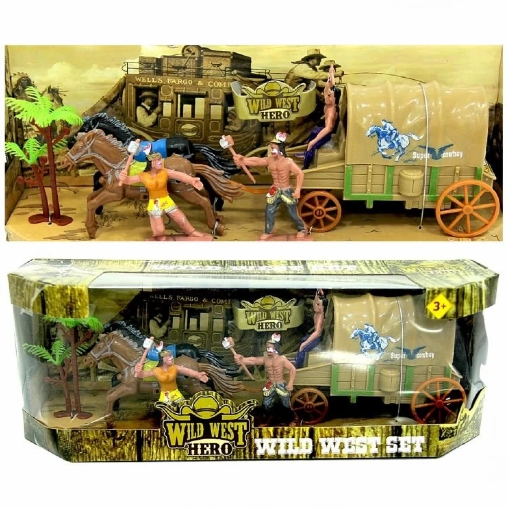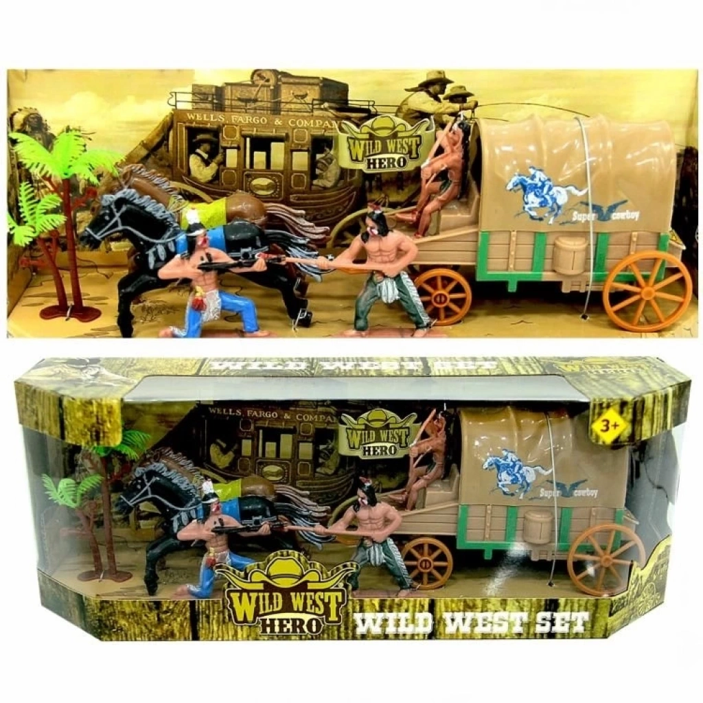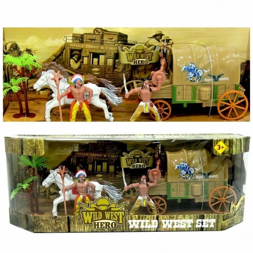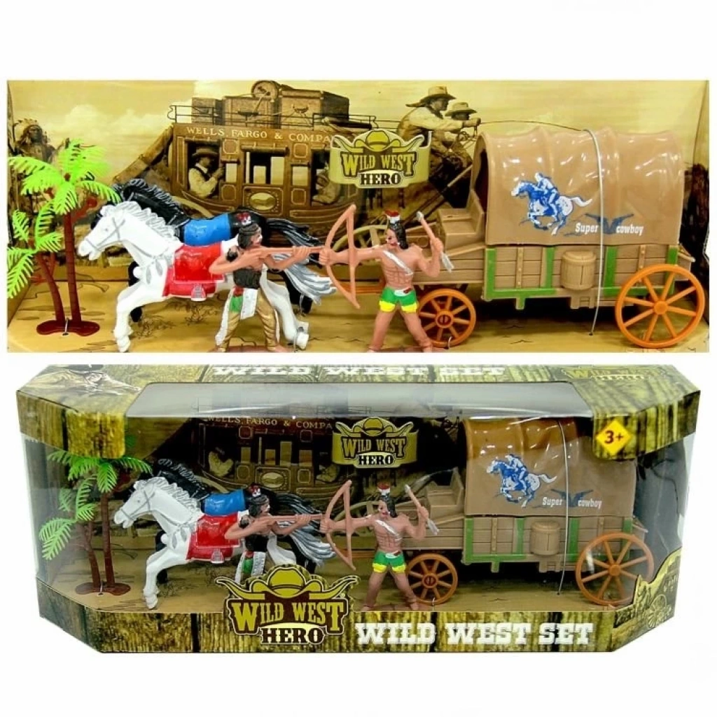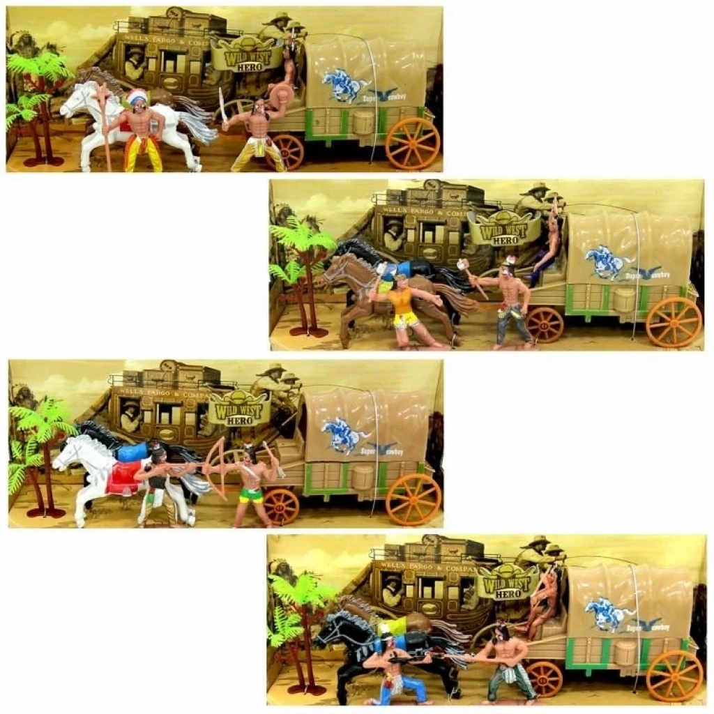 Set içerisinde; at arabası, 2 adet at figürü ve ürünün temasına uygun olan Kızılderili veya kovboy figürleri yer almaktadır.