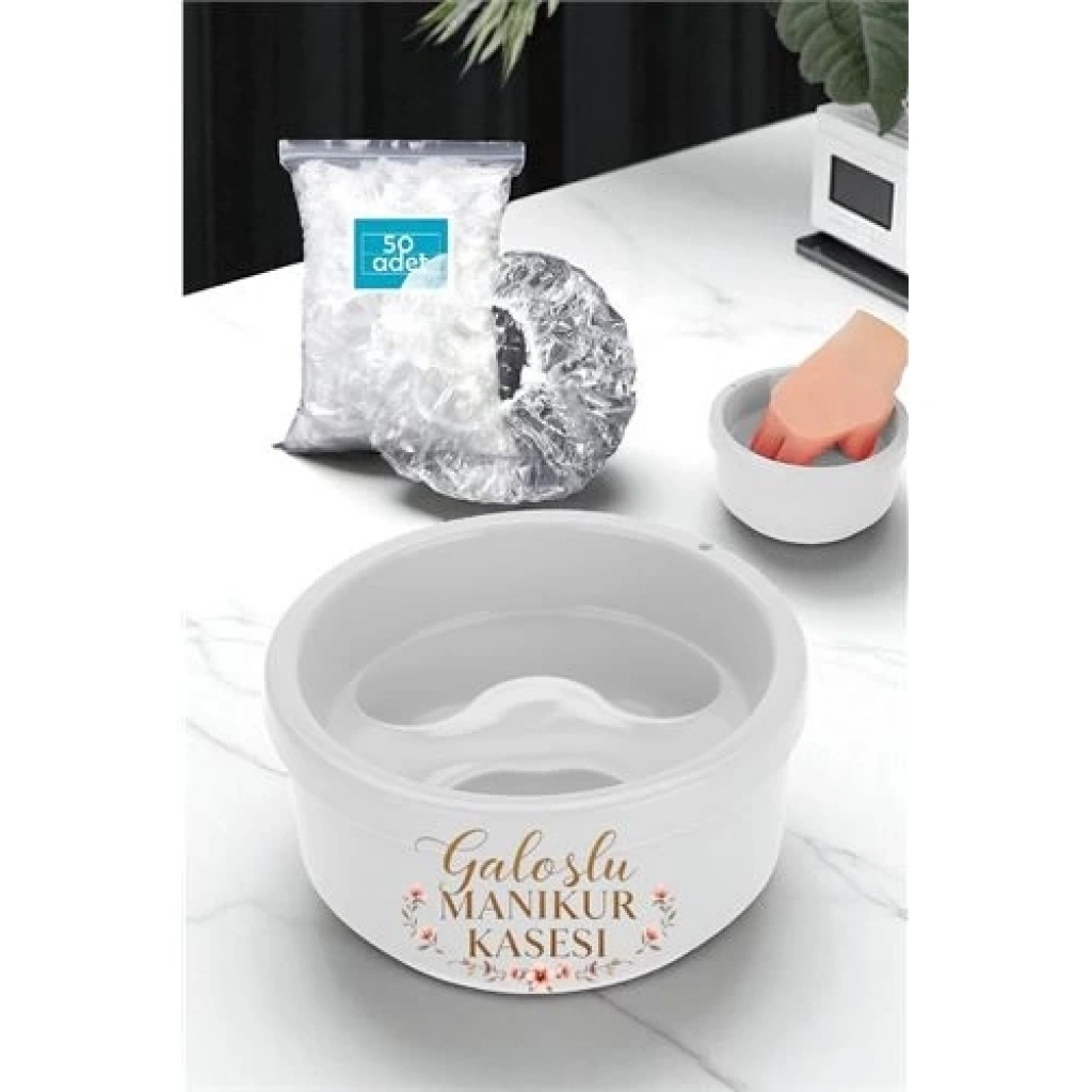 - Bu set, manikür öncesi ellerin yumuşatılması ve hijyenik bakım için kase ve 50 adet galoş içerir.