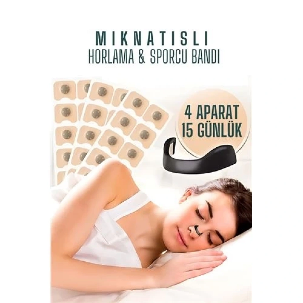 Mıknatıslı Horlama & Sporcu Bandı: - Mikro mıknatıslar sayesinde burun çevresindeki kan dolaşımını destekler. - Uyku sırasında burun tıkanıklığını azaltır, horlamayı önlemeye yardımcı olur. - 4 aparatlık set, 15 günlük kullanım sunar. - Gece kullanımı ve sporcu nefes desteği için optimize edilmiştir.