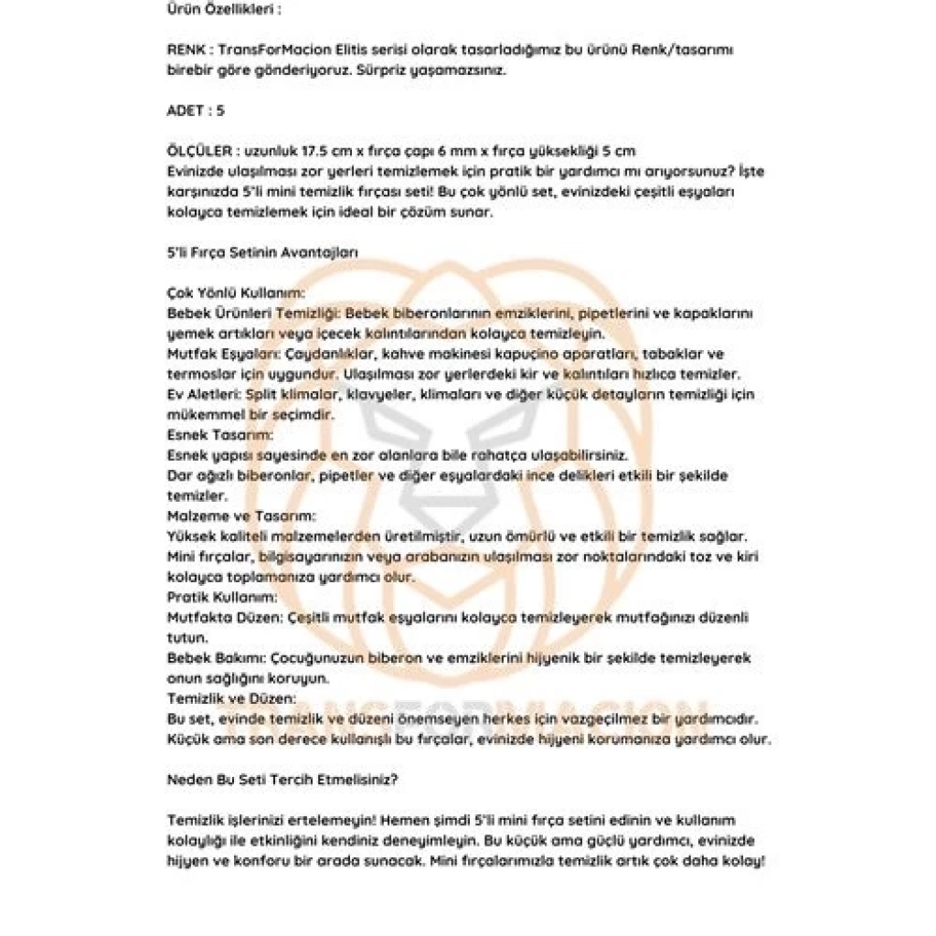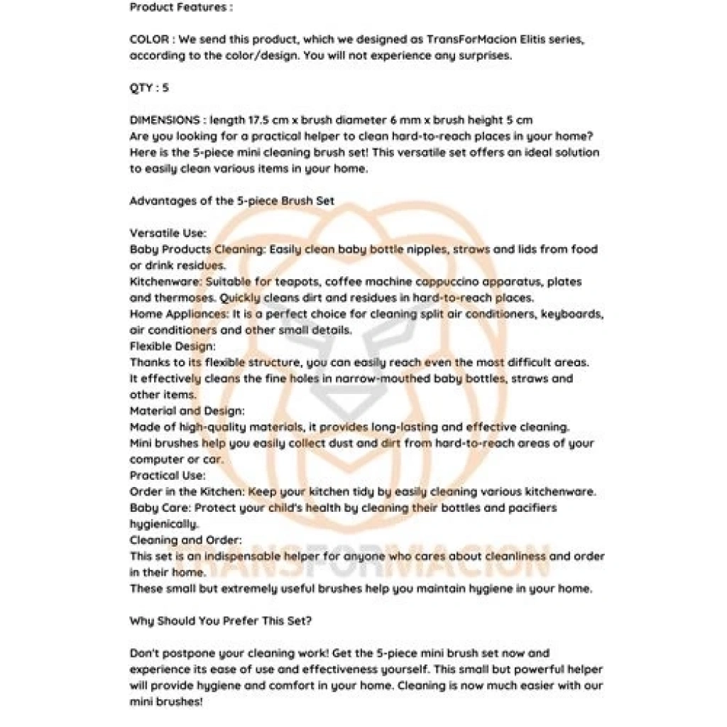 Temizlik işlerinizi ertelemeyin! Hemen şimdi 5’li mini fırça setini edinin ve kullanım kolaylığı ile etkinliğini kendiniz deneyimleyin. Bu küçük ama güçlü yardımcı, evinizde hijyen ve konforu bir arada sunacak. Mini fırçalarımızla temizlik artık çok daha kolay!