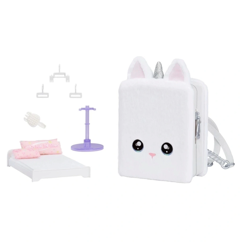 O da ne? Na! Na! Na! Surprise sırt çantası açıldığında Na! Na! Na! minis bebekleriniz için yatak odasına dönüşüyor! İçerisinden katlanabilir yatak, çekmece, yastık, battaniye ve askılar olan bir yatak odası oyun seti ortaya çıkıyor.