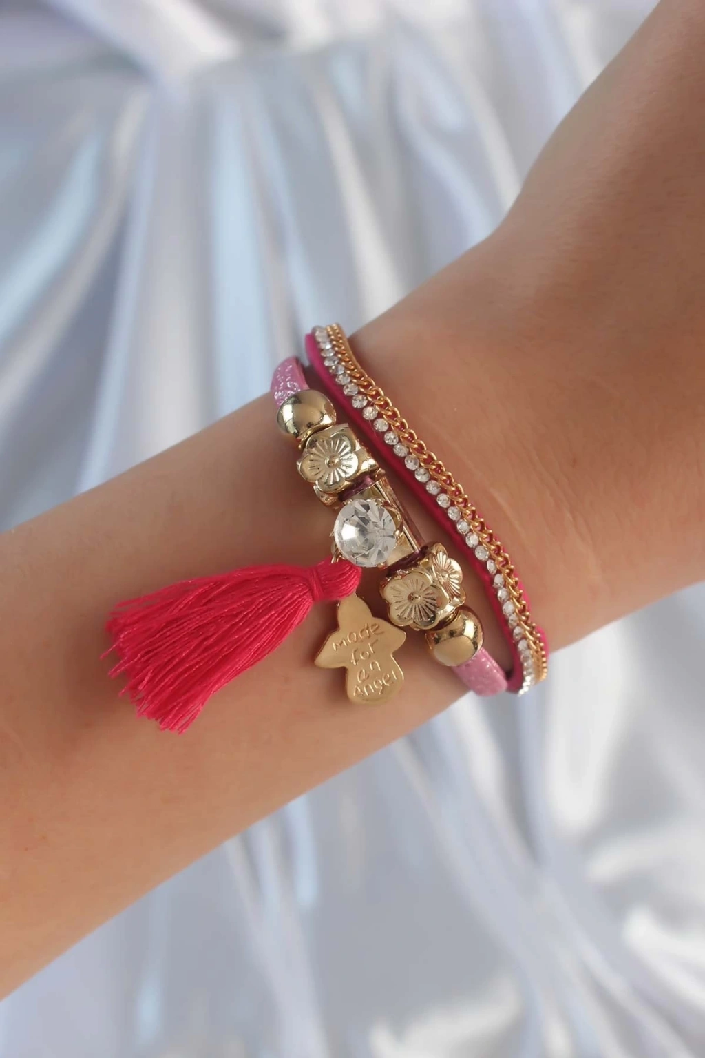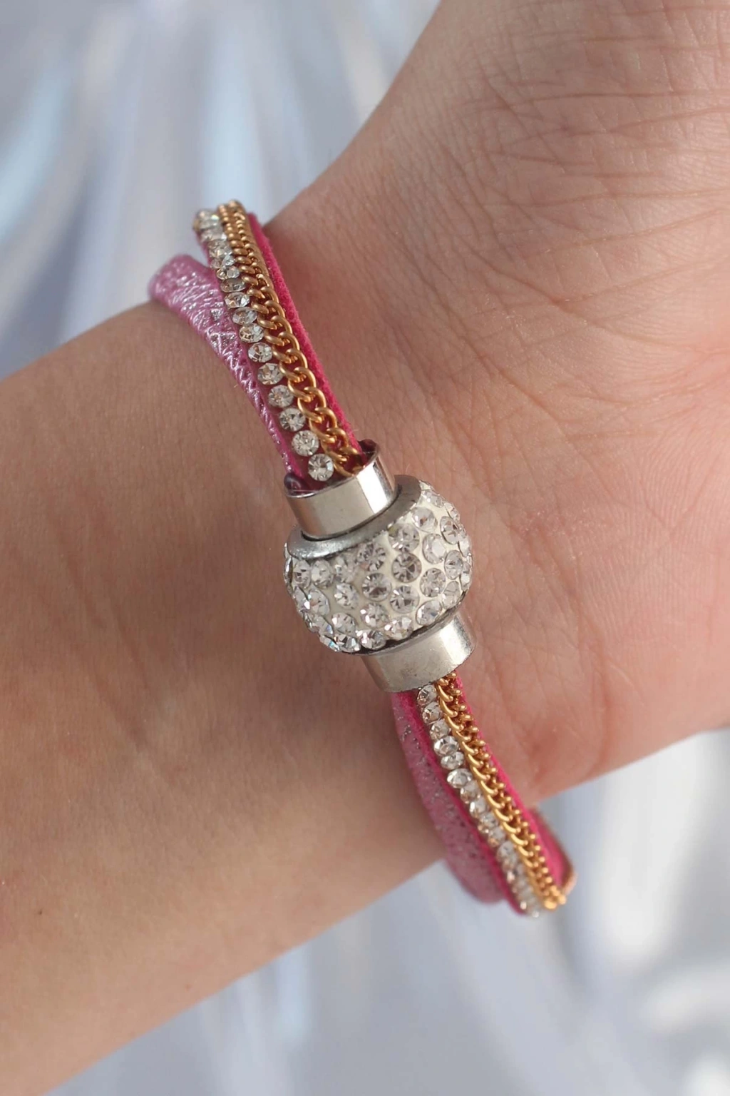 BFS Pembe Renk Zirkon Taşlı Püskül Detay Deri Çoklu Bileklik