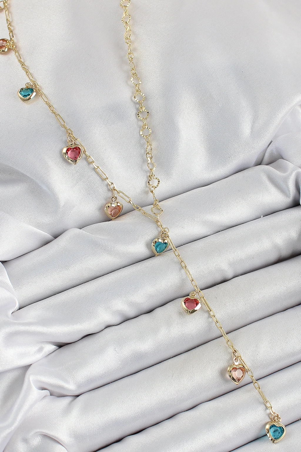 BFS Pirinç Asorti Kalp Model Gold Renk Zirkon Taşlı Y Kolye