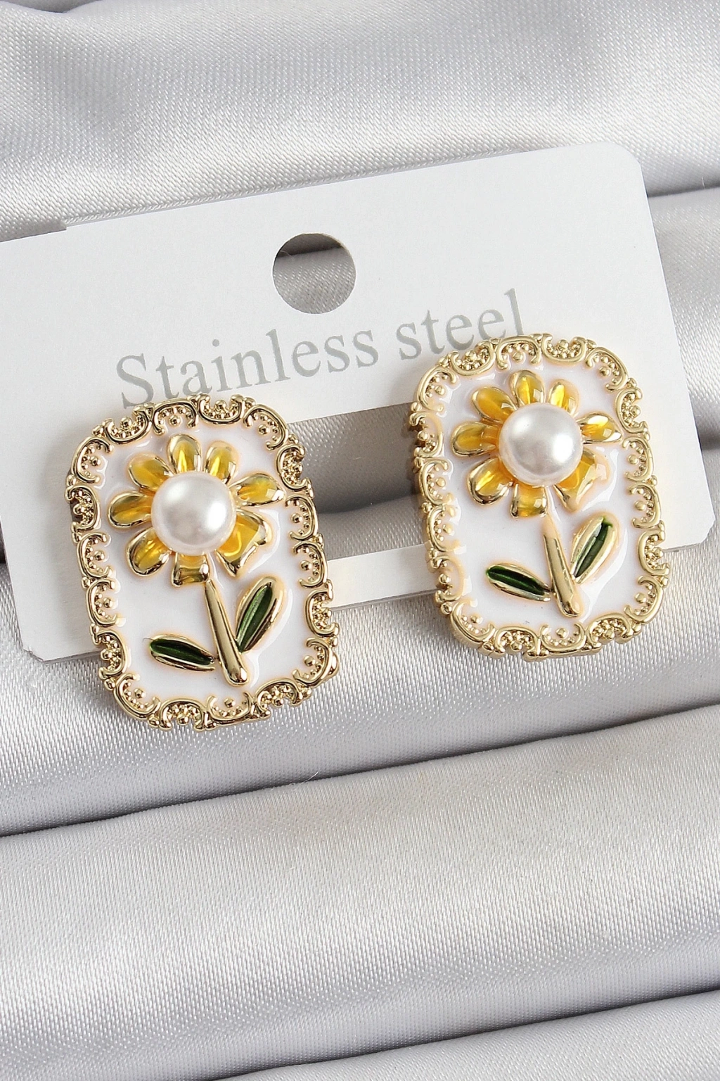 BFS Pirinç Beyaz Mineli Papatya Figürlü Sanatsal Portre Model Gold Renk Kadın Küpe