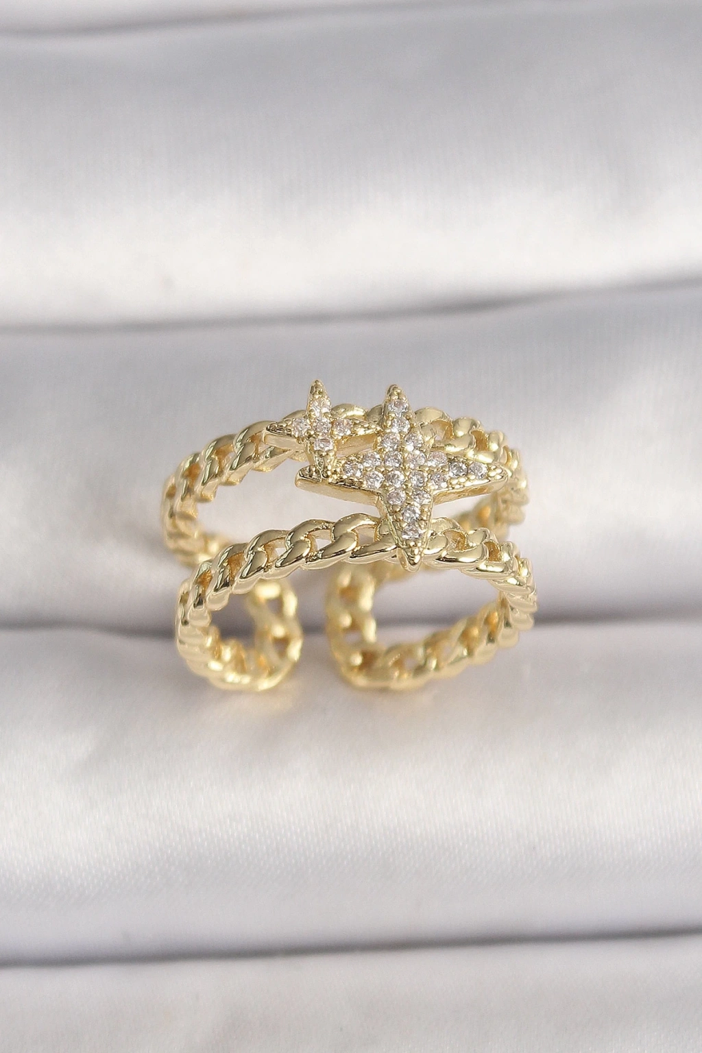 BFS Pirinç Gold Renk 2'Li Zincir Zirkon Taşlı Yıldız Figür Kadın Yüzük