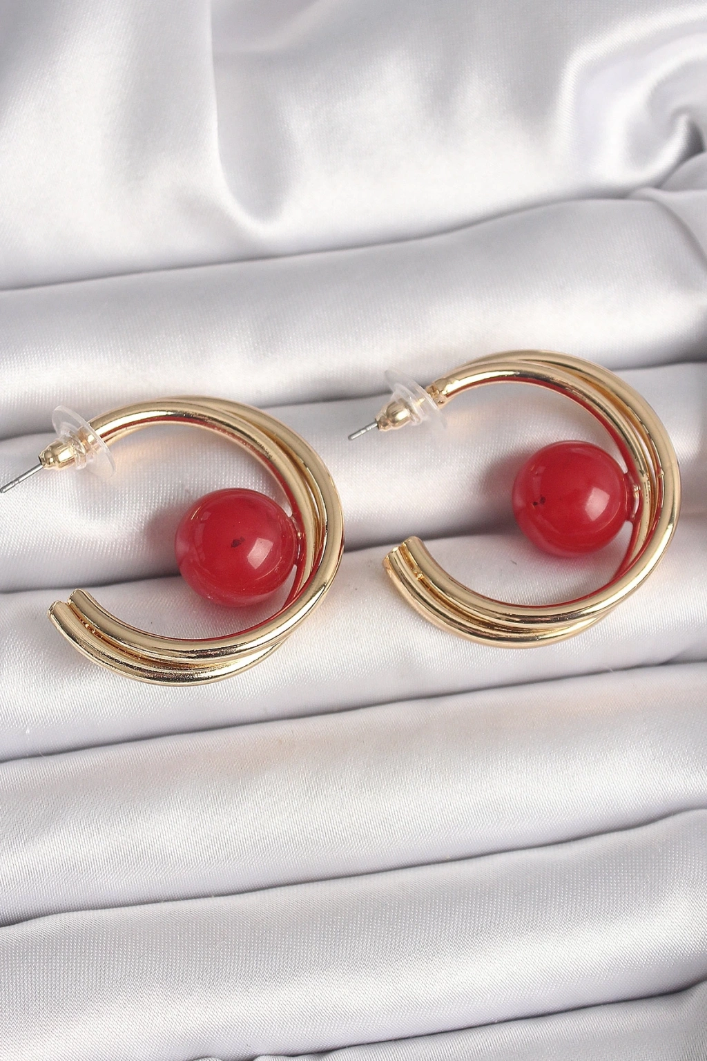 BFS Pirinç Gold Renk Halka Model Kırmızı Boncuk Detay Kadın Küpe