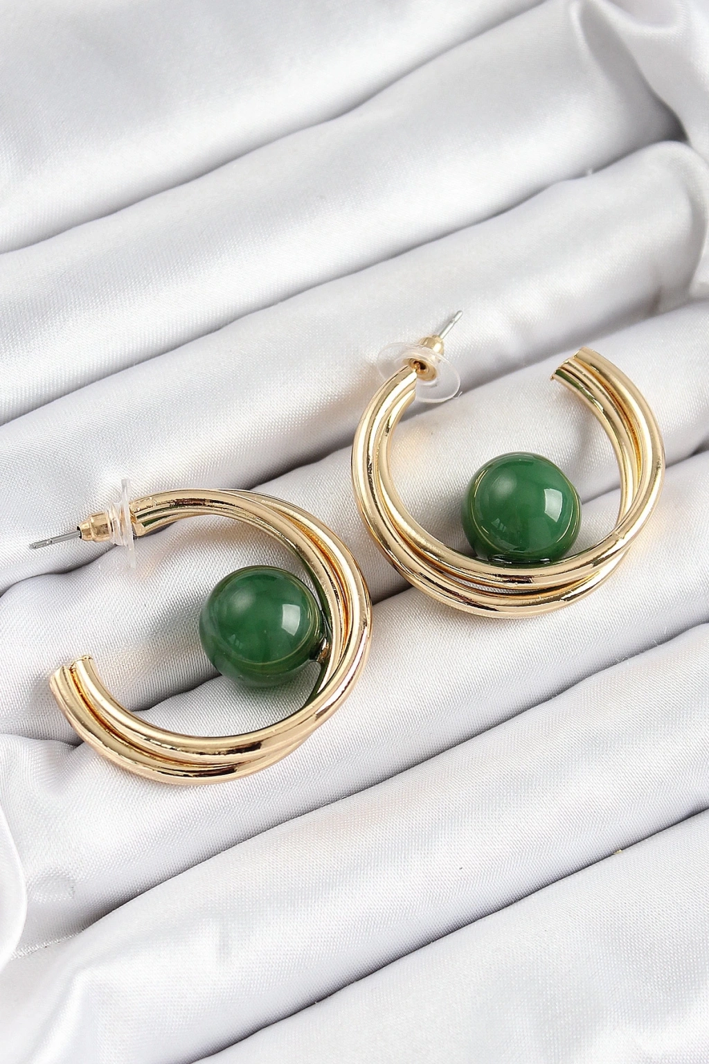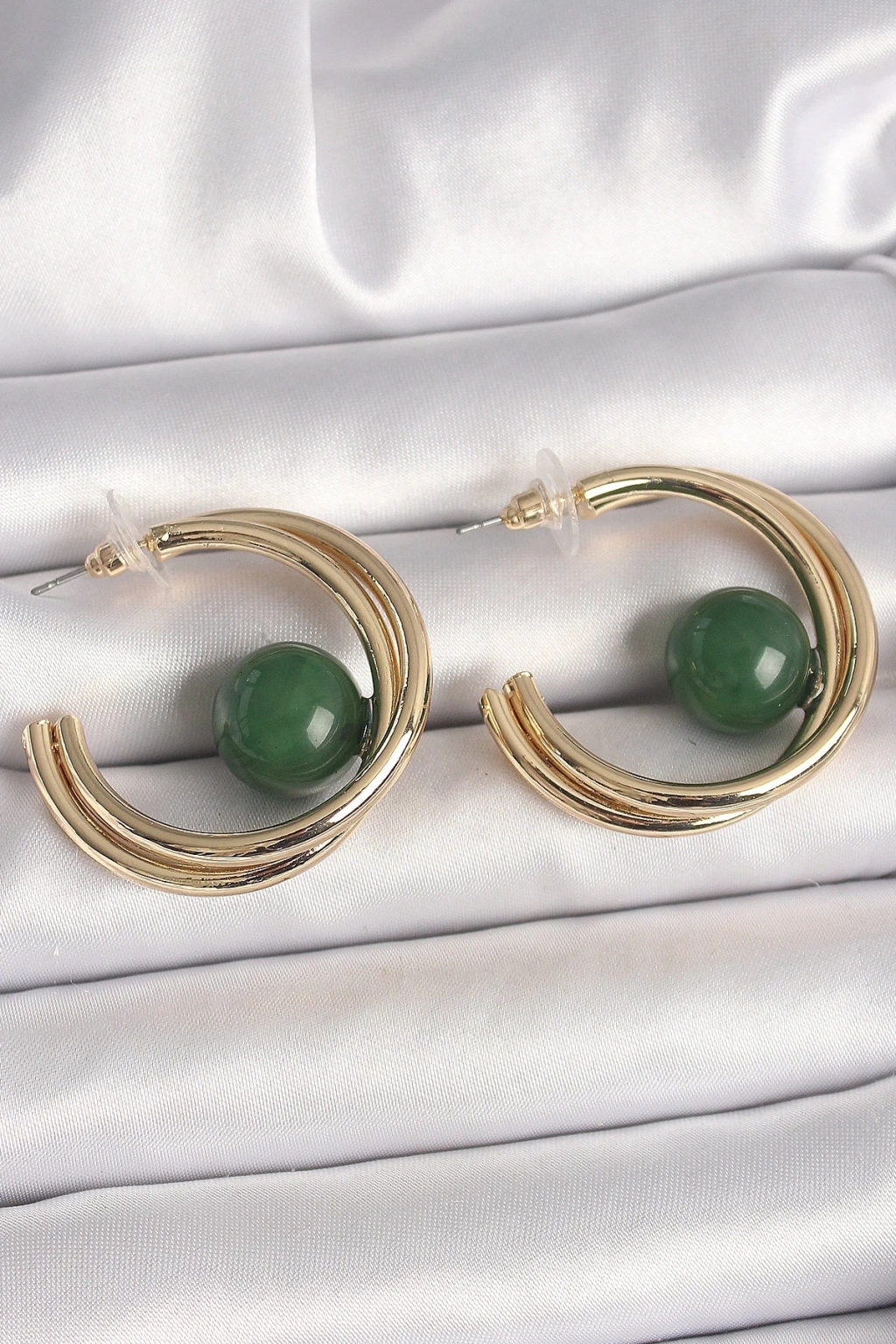 BFS Pirinç Gold Renk Halka Model Yeşil Boncuk Detay Kadın Küpe