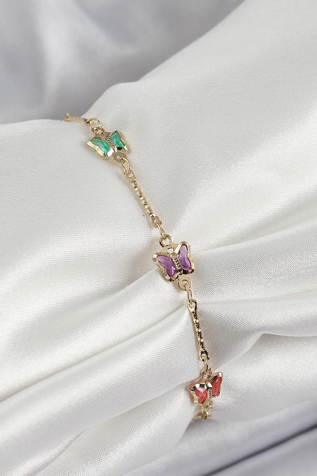 BFS Pirinç Gold Renk Karışık Renk Kelebek Zirkon Taşlı Kadın Bileklik