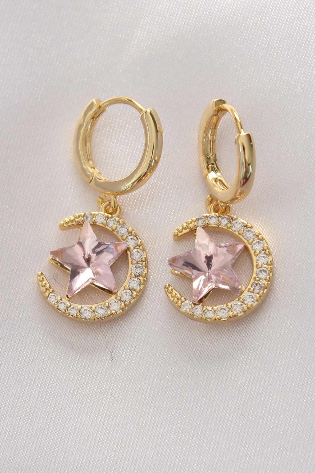 BFS Pirinç Gold Renk Pembe Zirkon Taşlı Yıldız Detay Ay Küpe