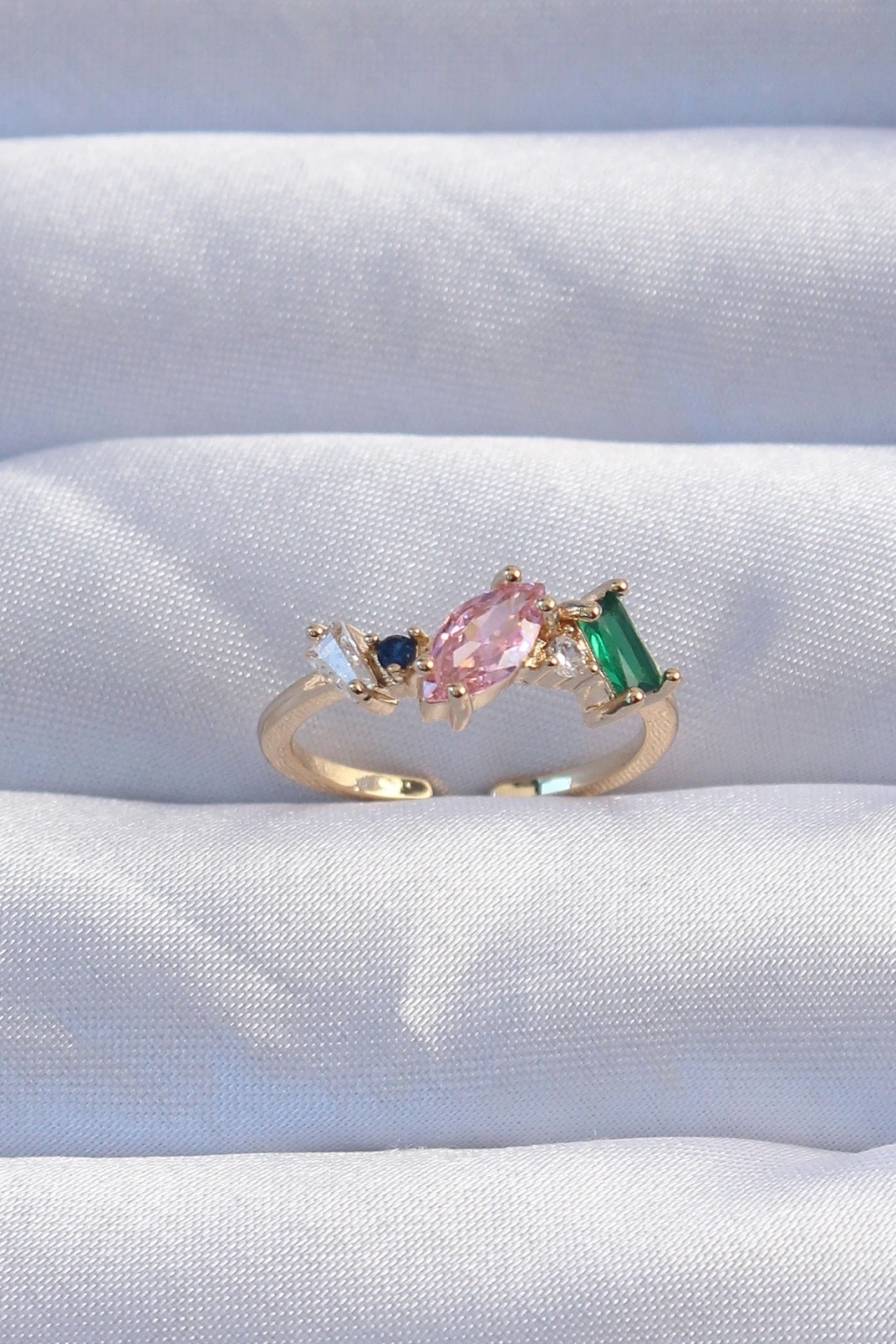 BFS Pirinç Gold Renk Renkli Zirkon Taşlı Ayarlanabilir Yüzük