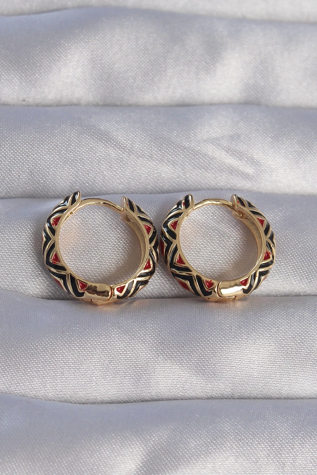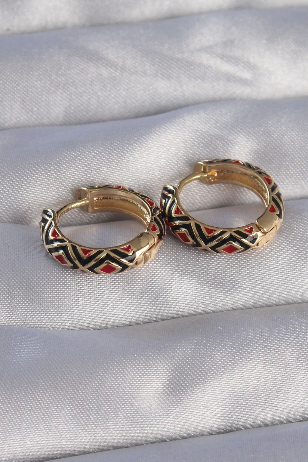 BFS Pirinç Gold Renk Siyah Etnik Desenli Halka Küpe