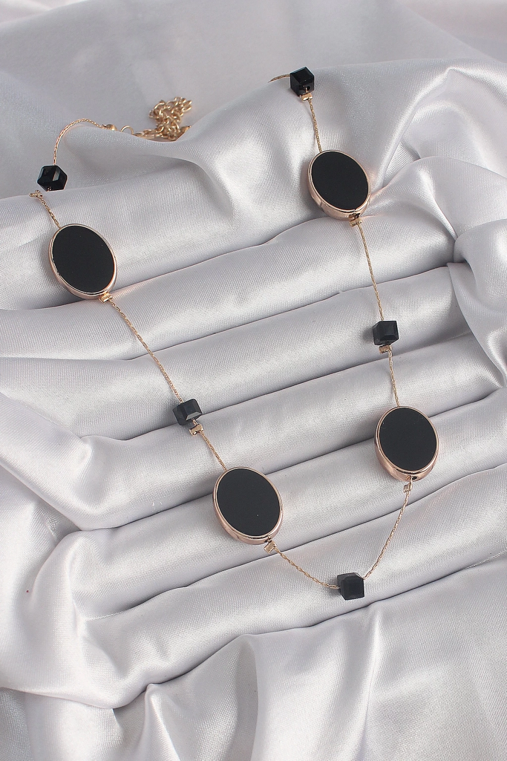 BFS Pirinç Gold Renk Siyah Renk Oval Siyah Küp Detay Kadın Kolye