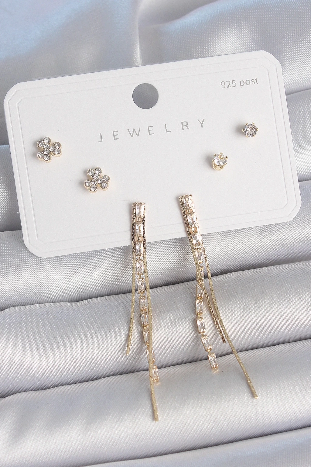 BFS Pirinç Gold Renk Su Yolu Zirkon Taşlı Sallantı Model Çiçek Detay 925 Ayar Gümüş Çivi Kadın Küpe Seti