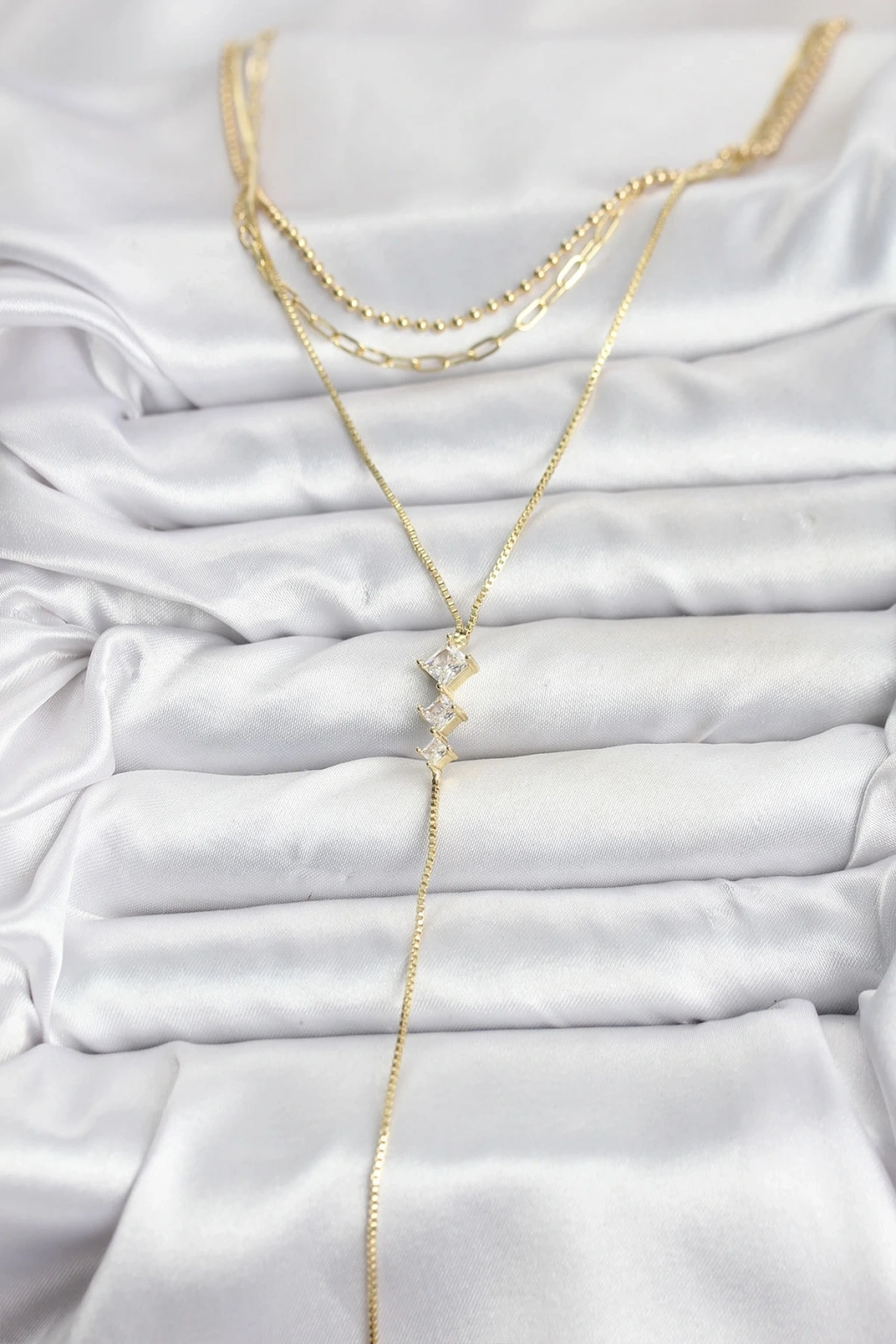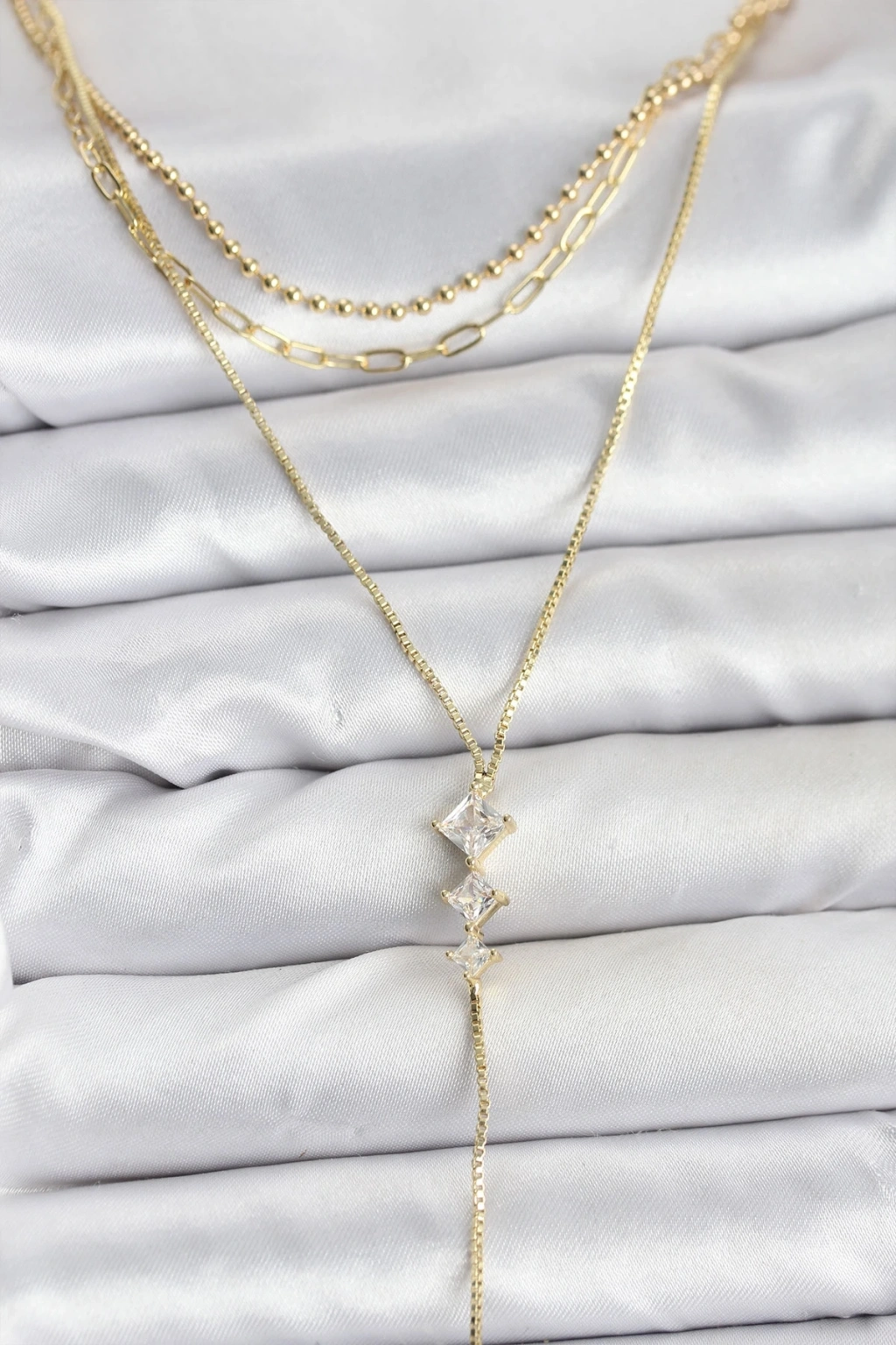BFS Pirinç Gold Renk Zirkon Taş Detaylı 3'lü Kombin Y Kadın Kolye
