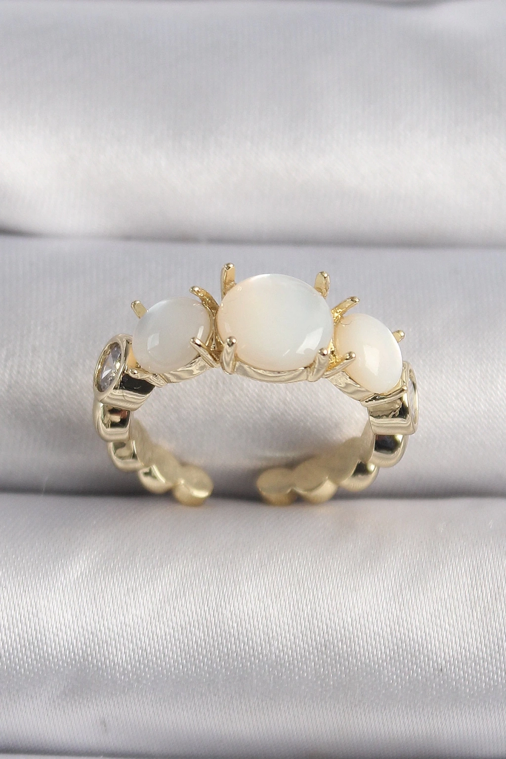 BFS Pirinç Gold Renk Zirkon Taş Detaylı Beyaz Sedefli VIP Seri Kadın Yüzük