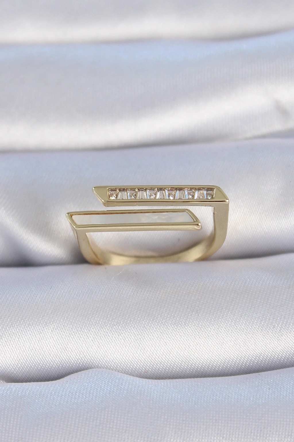 BFS Pirinç Gold Renk Zirkon Taşlı Beyaz Sedef Detay Kadın Yüzük