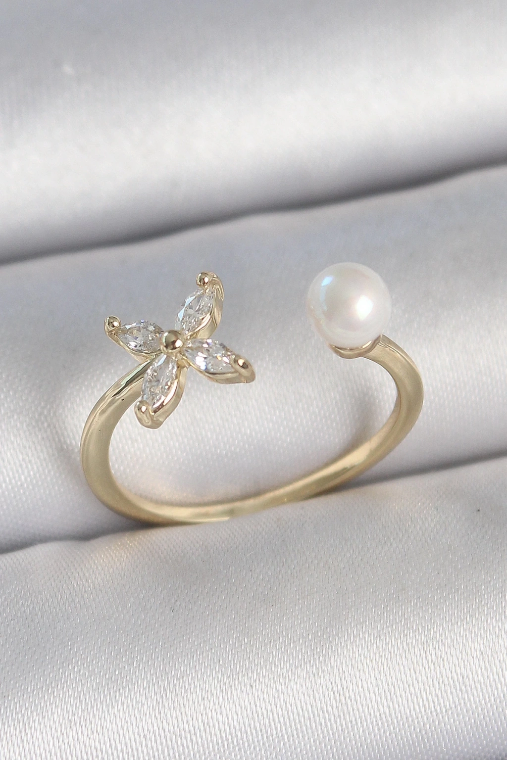 BFS Pirinç Gold Renk Zirkon Taşlı Çiçek Model İnci Detay Ayarlanabilir Kadın Yüzük