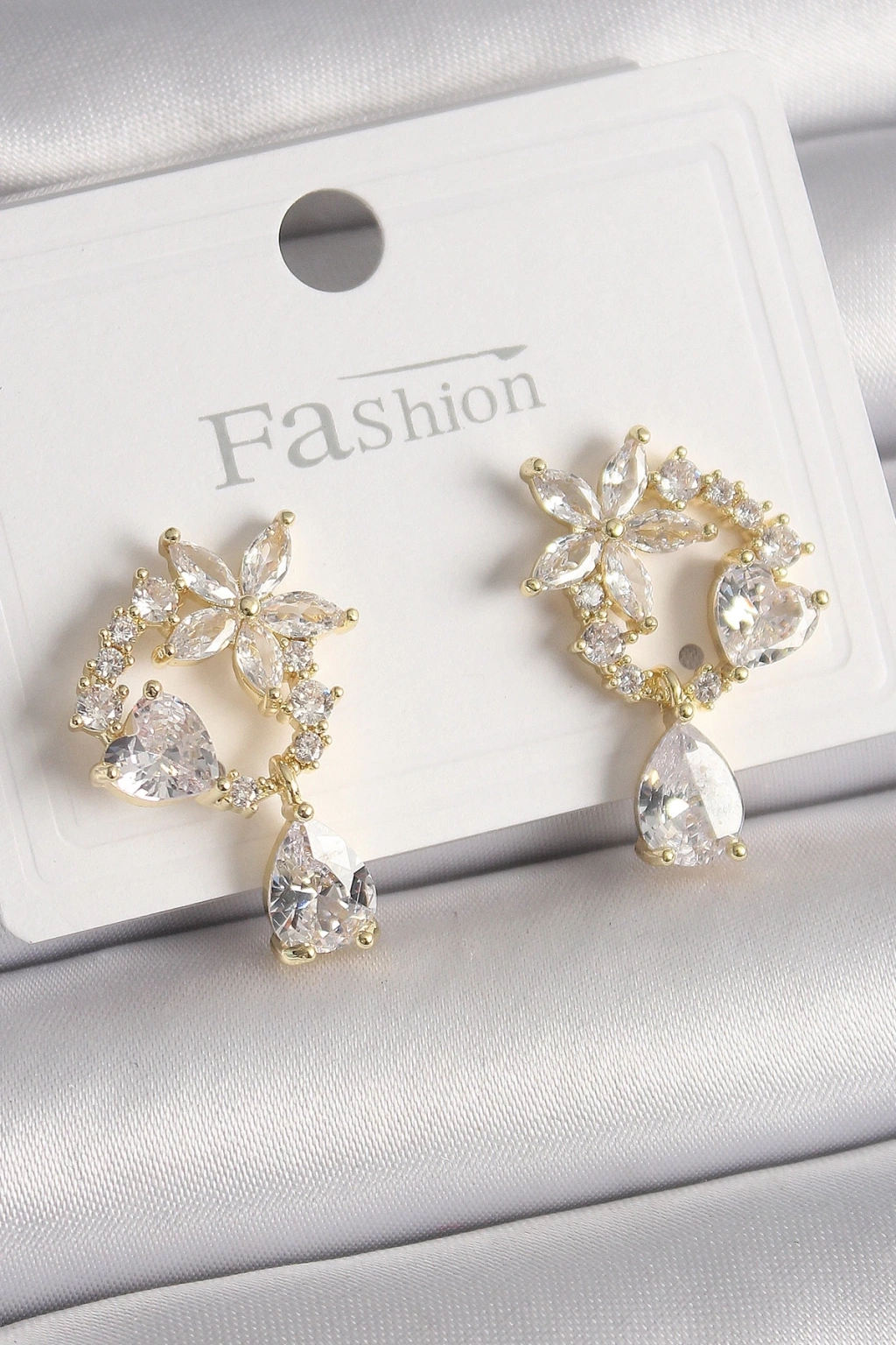 BFS Pirinç Gold Renk Zirkon Taşlı Çiçek Model Sallantı Damla Detay Kadın Küpe