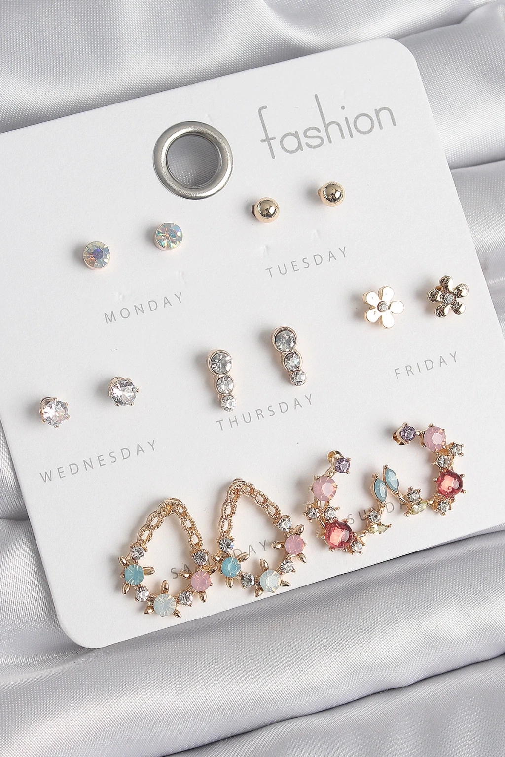 BFS Pirinç Gold Renk Zirkon Taşlı Damla Model Yıldız Detaylı 7 Çift Kadın Küpe Seti