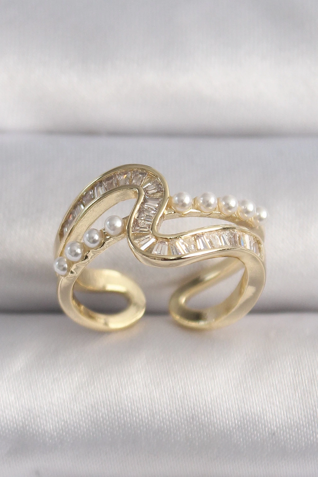 BFS Pirinç Gold Renk Zirkon Taşlı İnci Detay VIP Seri Kadın Yüzük