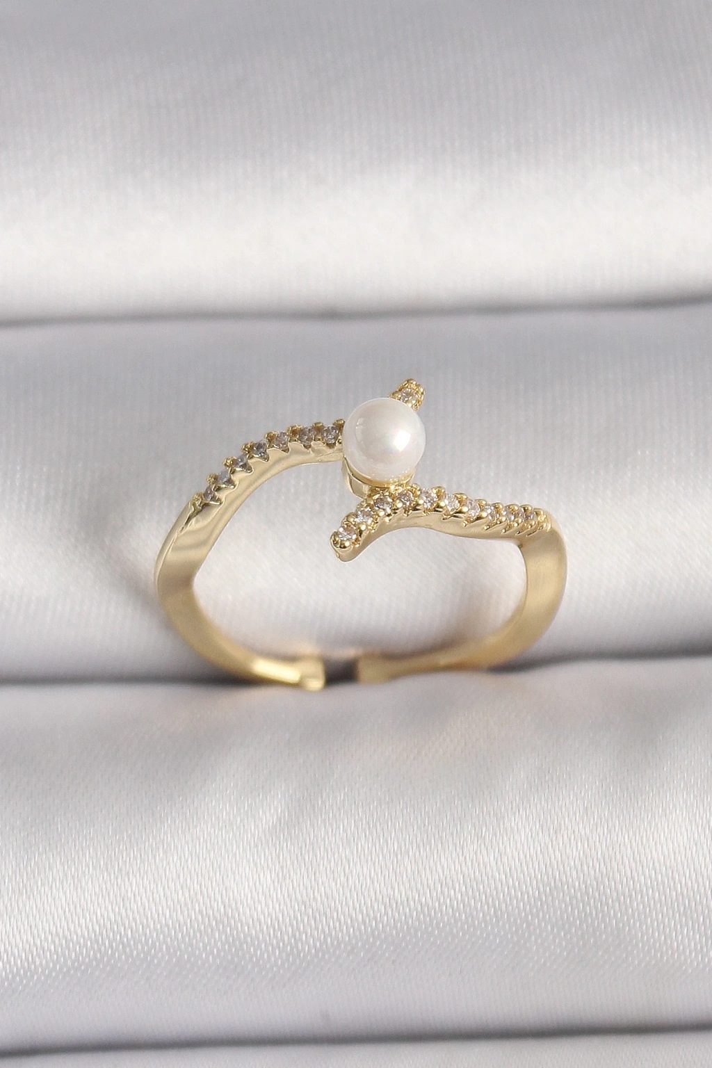 BFS Pirinç Gold Renk Zirkon Taşlı İncili Ayarlanabilir Yüzük