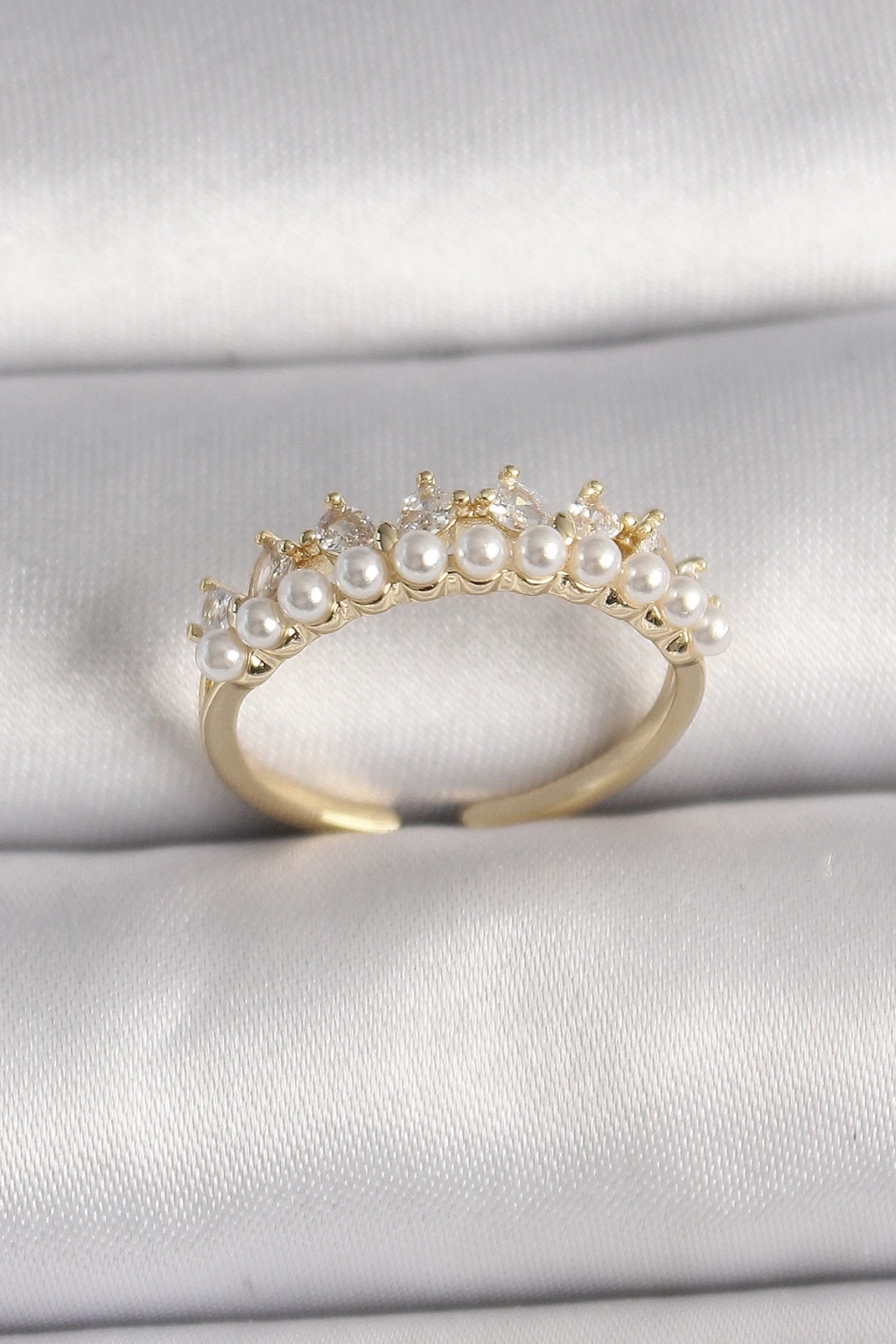 BFS Pirinç Gold Renk Zirkon Taşlı İncili Taç Model Ayarlanabilir Kadın Yüzük