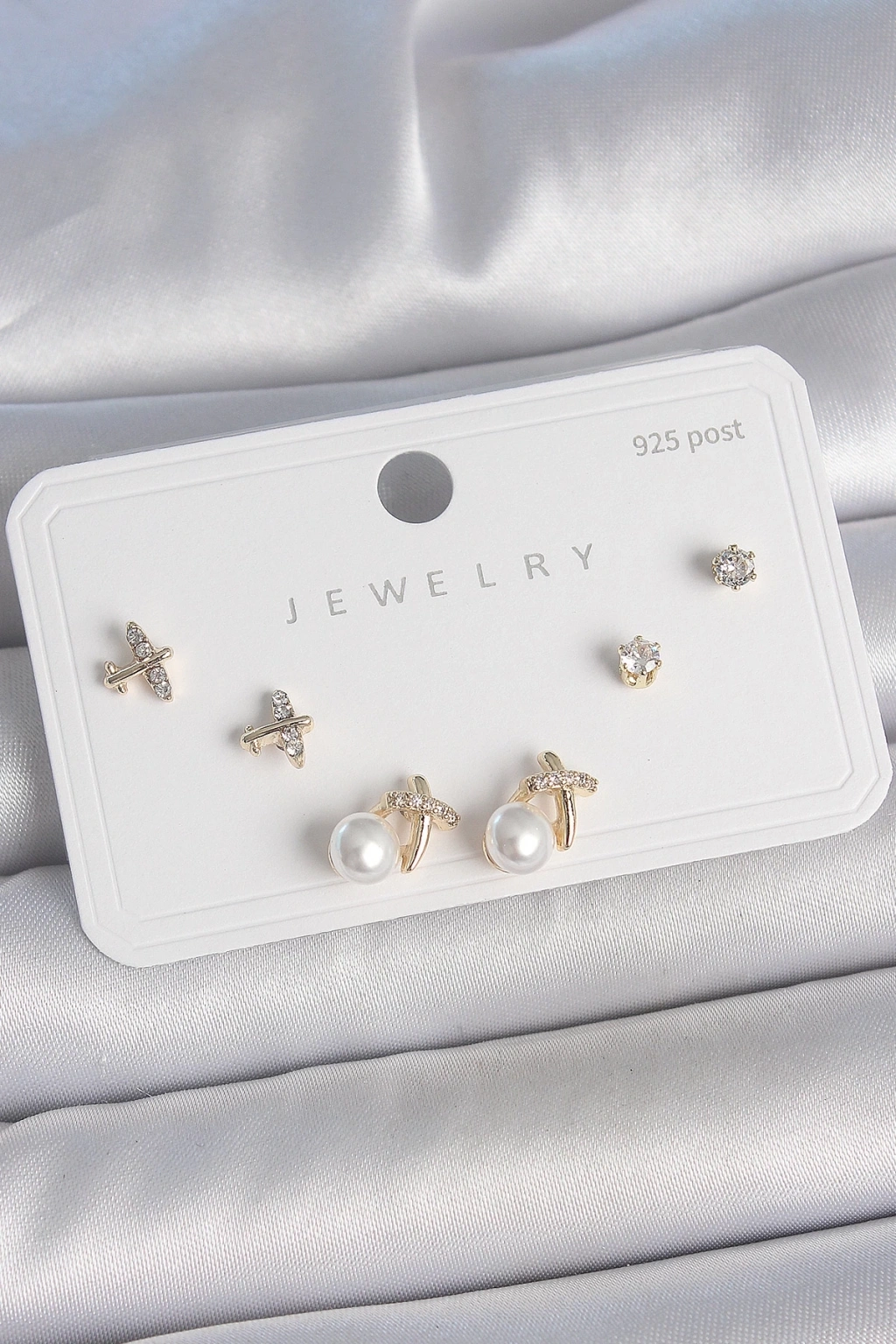 BFS Pirinç Gold Renk Zirkon Taşlı Kelebek Model İnci Detay 925 Ayar Gümüş Çivi Kadın Küpe Seti