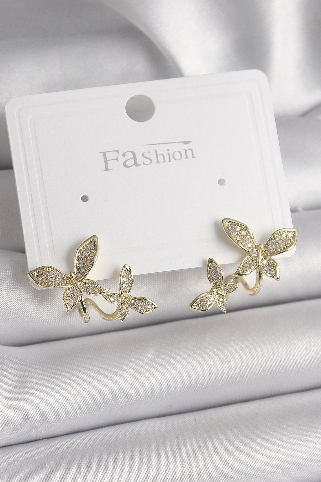 BFS Pirinç Gold Renk Zirkon Taşlı Kelebek Model Kadın Küpe