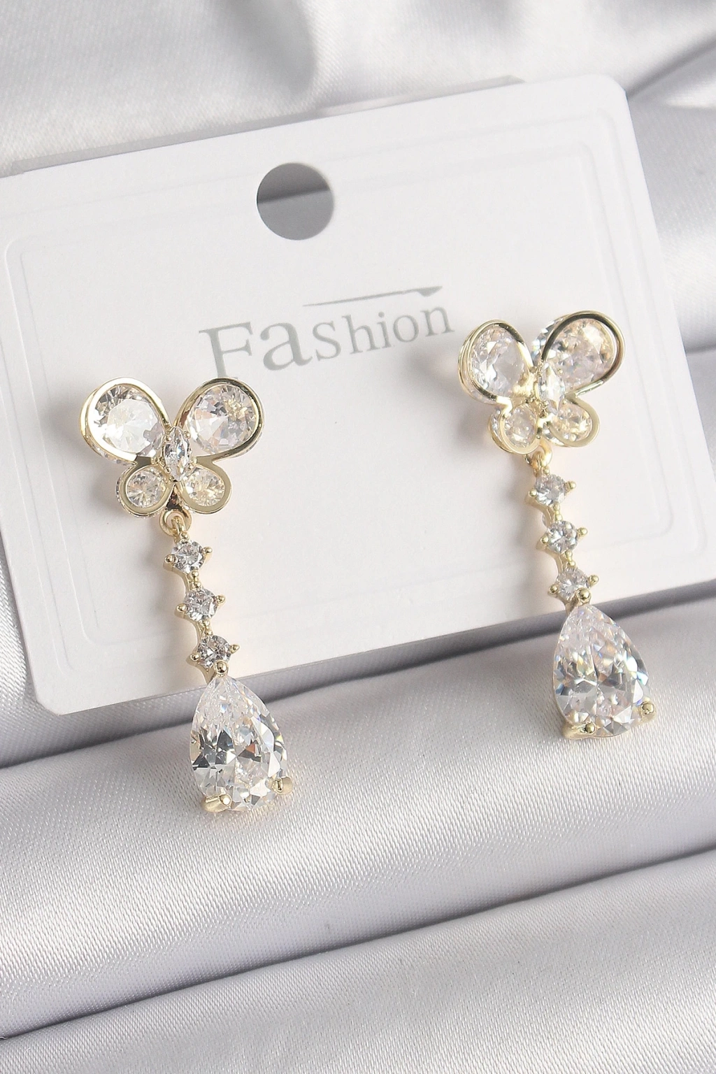 BFS Pirinç Gold Renk Zirkon Taşlı Kelebek Model Sallantı Damla Zirkon Taş Kadın Küpe