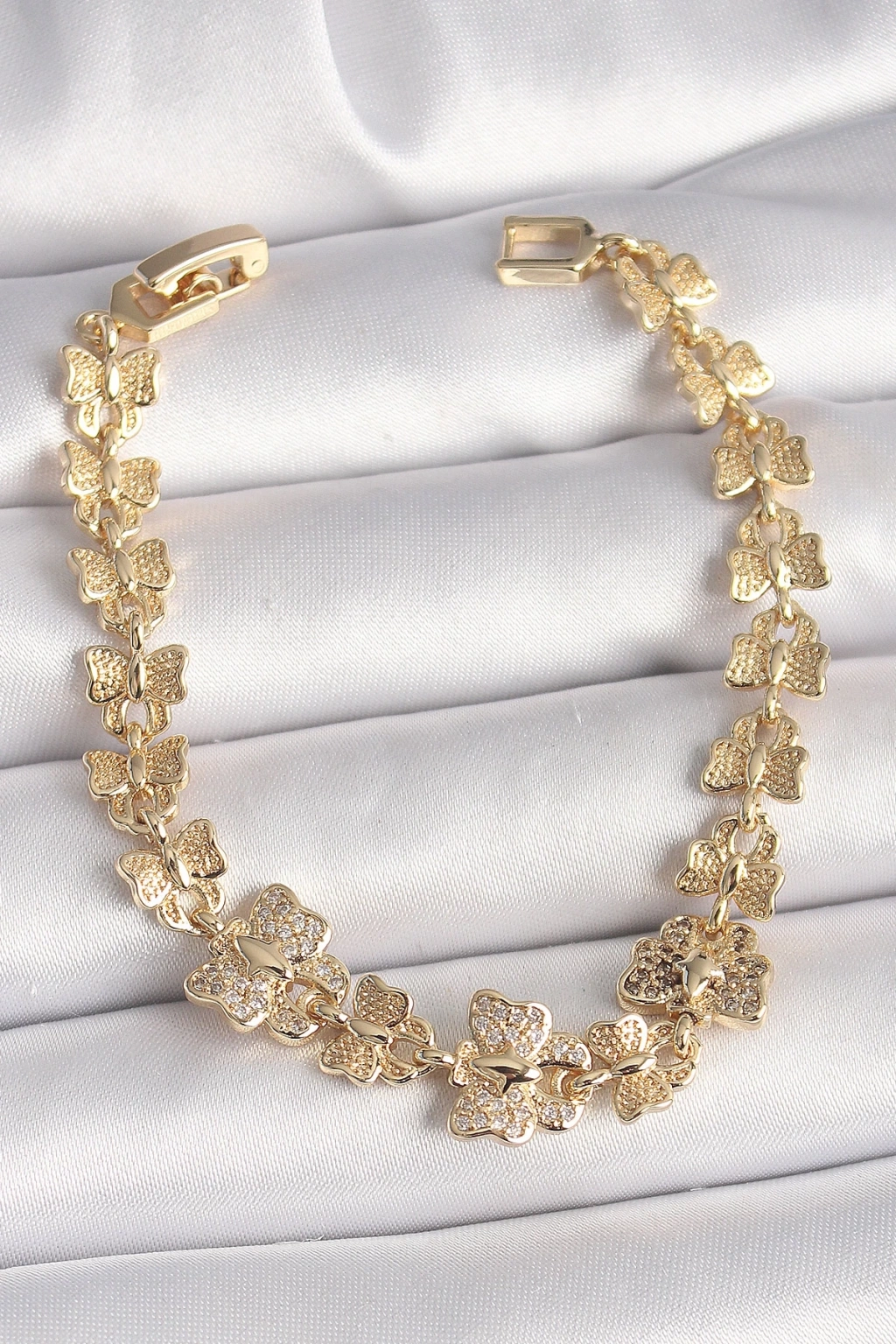 BFS Pirinç Gold Renk Zirkon Taşlı Kelebek Model Zincir Kadın Bileklik
