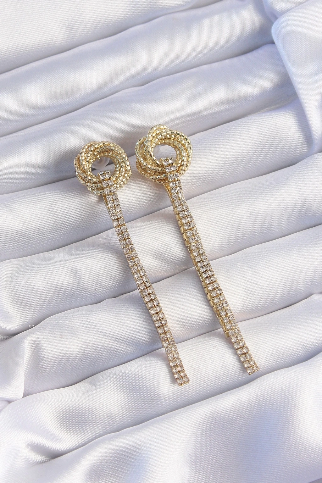 BFS Pirinç Gold Renk Zirkon Taşlı Kıvrım Detay Sallantılı Küpe
