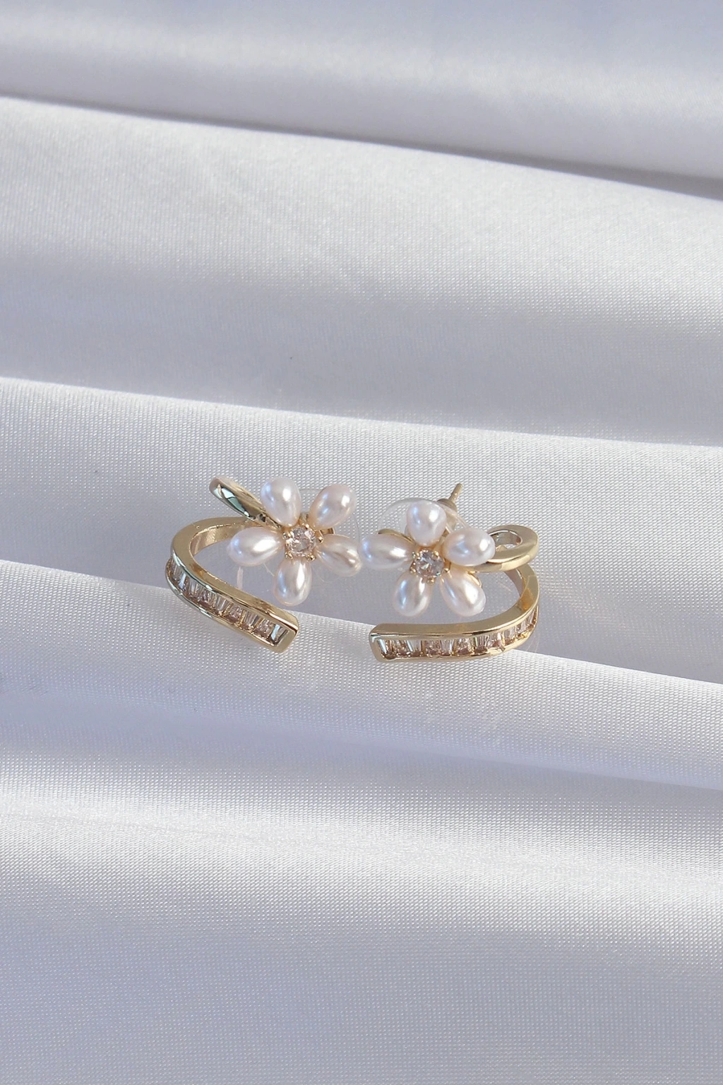 BFS Pirinç Gold Renk Zirkon Taşlı Kıvrımlı İnci Çiçek Küpe
