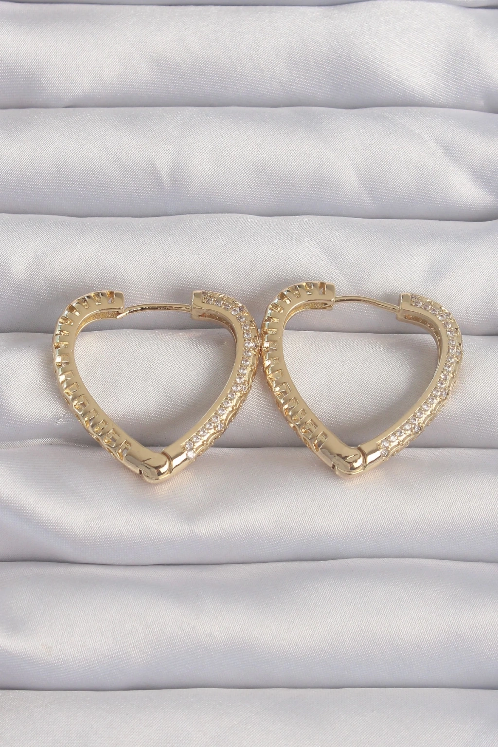BFS Pirinç Gold Renk Zirkon Taşlı Motifli Kalp Küpe